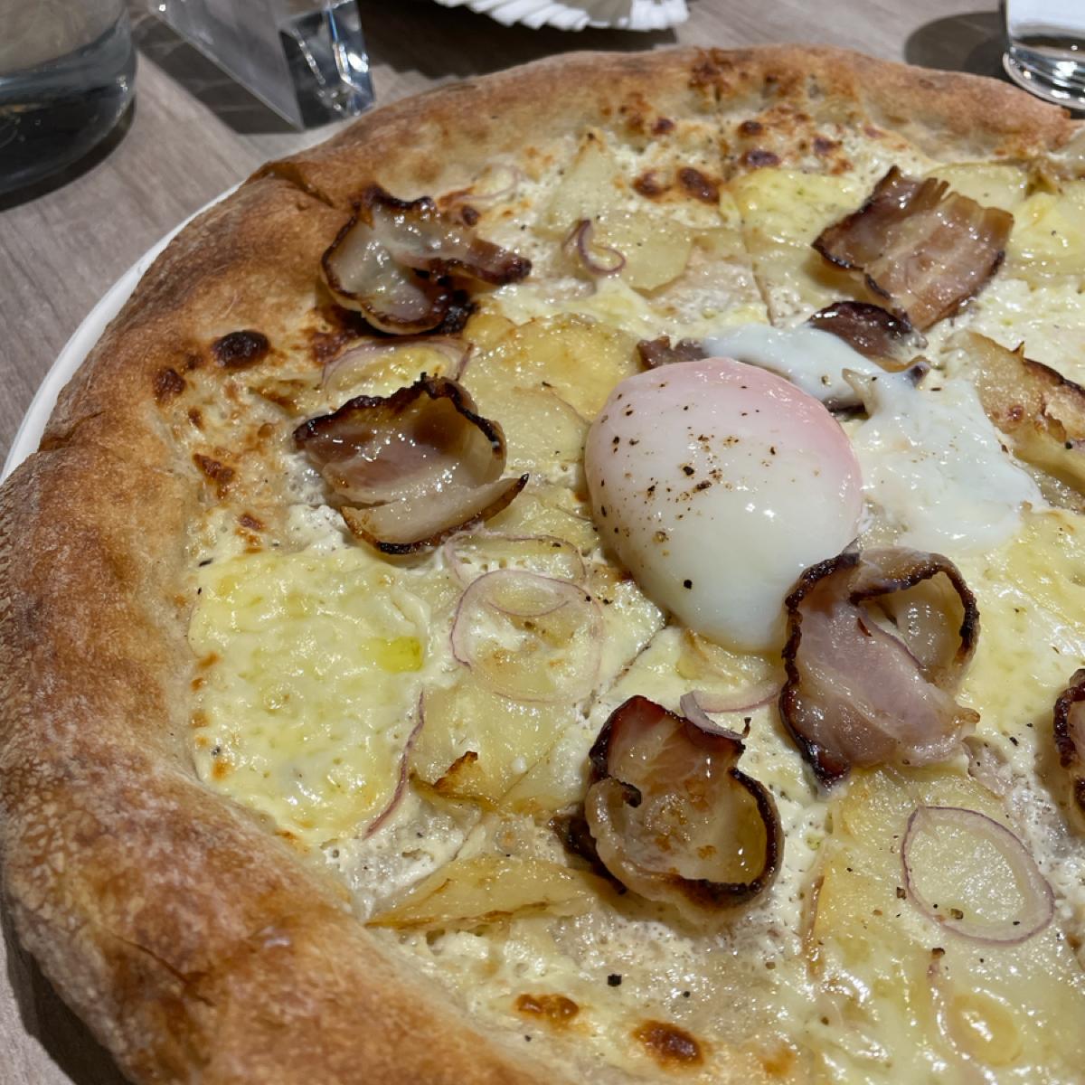 農夫披薩一級棒 生蛋抹開搭配薄脆餅皮 白醬跟薄切的馬鈴薯 培根 樸實好吃~