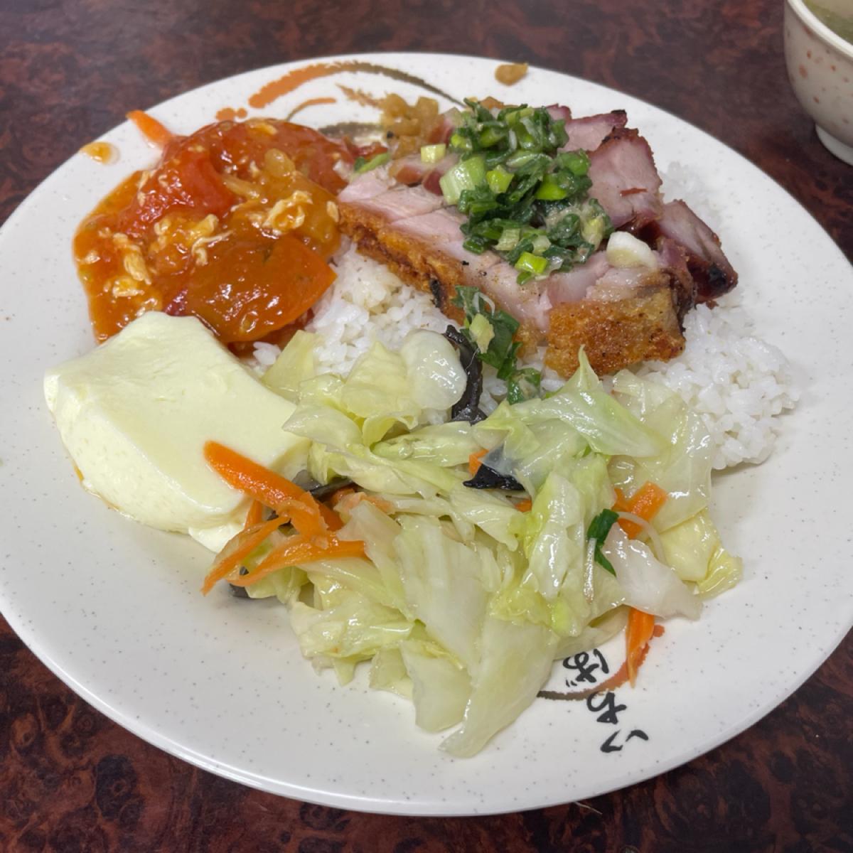 這次點了叉燒燒肉飯(100元): 肉的份量不算多,以價格來說算蠻正常的,燒肉偏鹹一點,不過搭配的蔥味道不錯,配菜3樣都算新鮮,不會有菜放太久的情況,店內還有免費的湯,裡面的料蠻多的。 整體CP值算普通,偶爾經過可以來吃吃