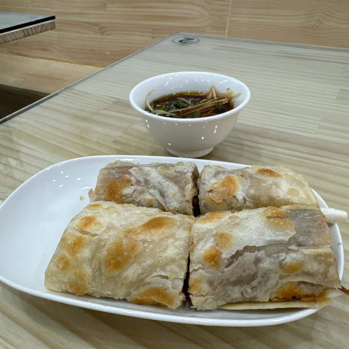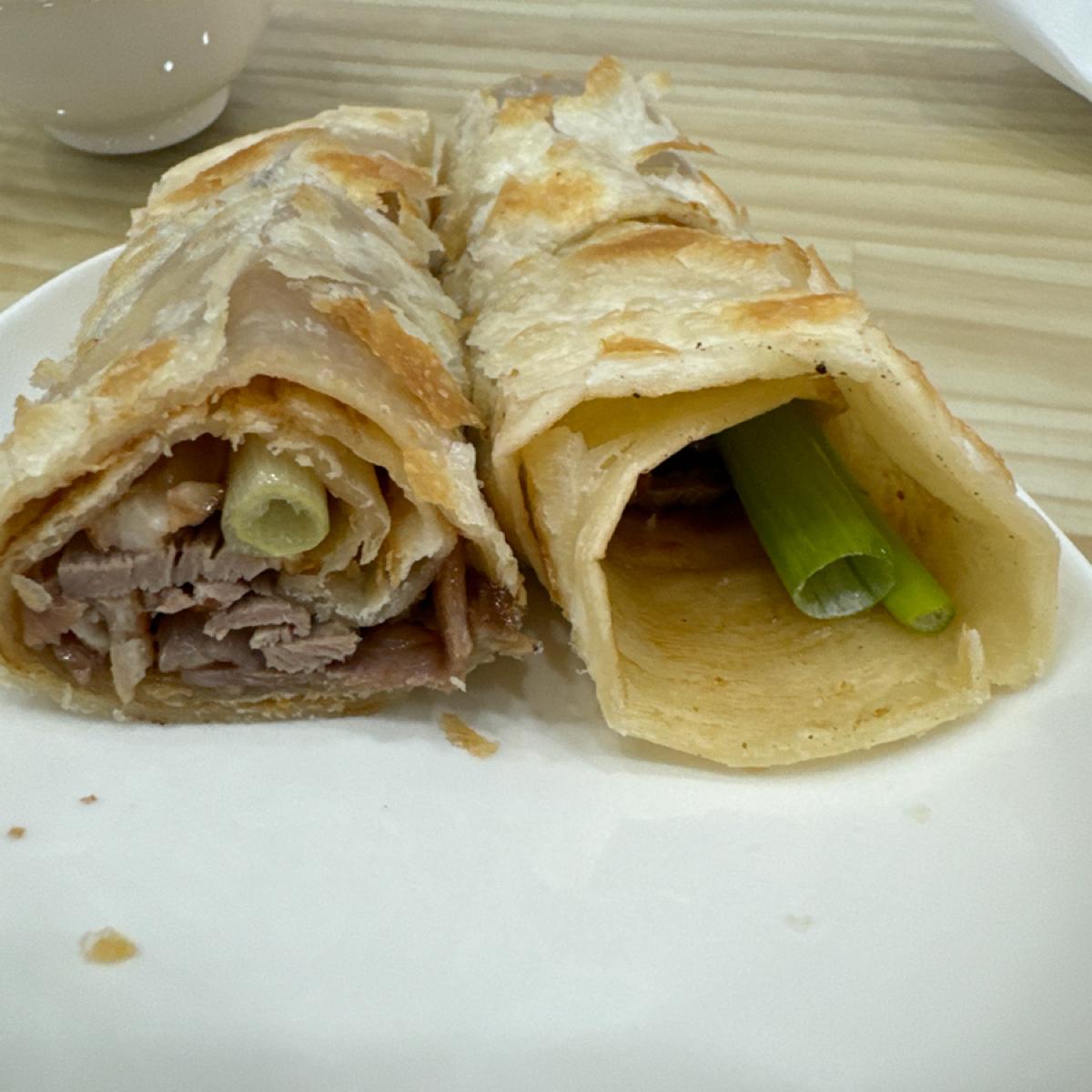 -烤鴨捲餅-135-份量偏少只有四片,裡面放的是切片烤鴨有帶皮跟油脂,整體鴨肉不柴鴨味滿香的!捲餅皮的部分比較普通像一層麵皮,只有外層有些許脆,中間就像咬普通麵粉皮,但沒什麼麵粉的香氣,也沒什麼層次感。另外就是甜麵醬與兩根蔥。如果這個價位的話回購意願低。