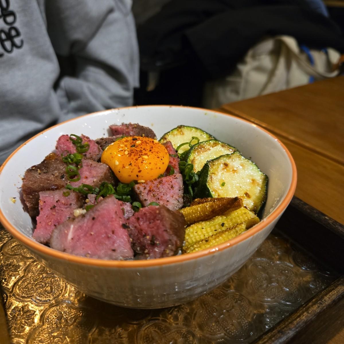 月見角切牛丼 $400