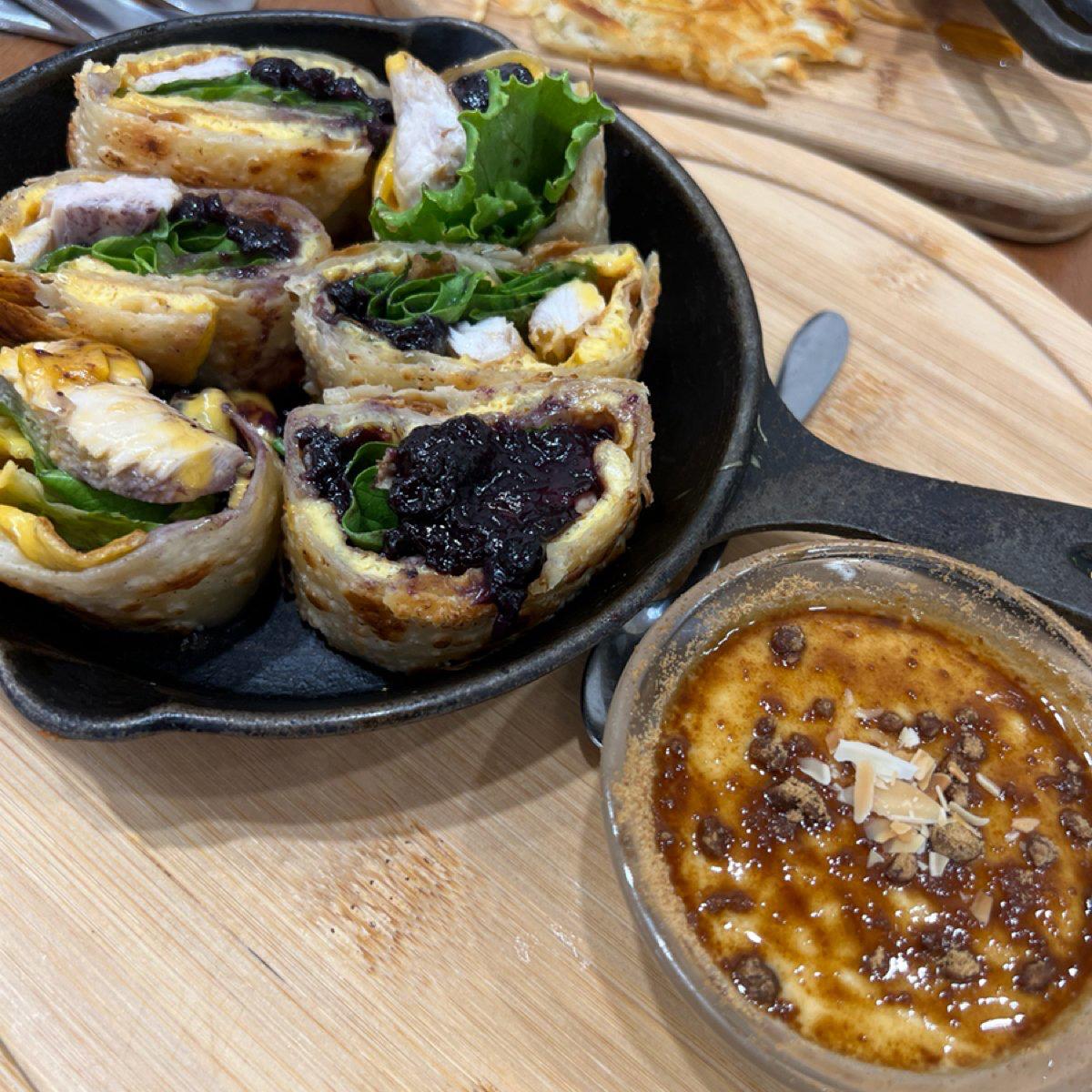 A. 藍莓雞肉起司蛋捲餅:口味上算是特別,不喜歡甜鹹甜鹹的人不建議點,但是如果可以接受的話建議嘗試看看,藍莓醬給的足,捲餅也脆脆的,也好吃!🫐