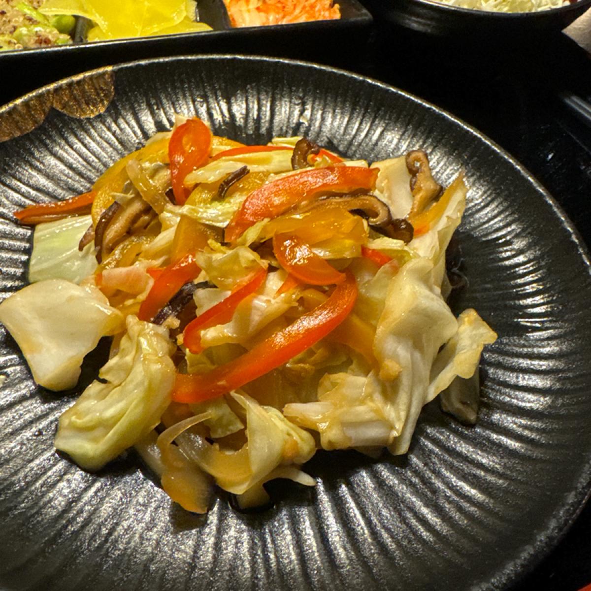 主菜的炒青菜就像日式的鐵板炒菜一樣是脆口的,調味甜鹹,蔬菜內容豐富,除了高麗菜,還有甜椒,洋蔥,香菇等,吃起來也不會太油膩