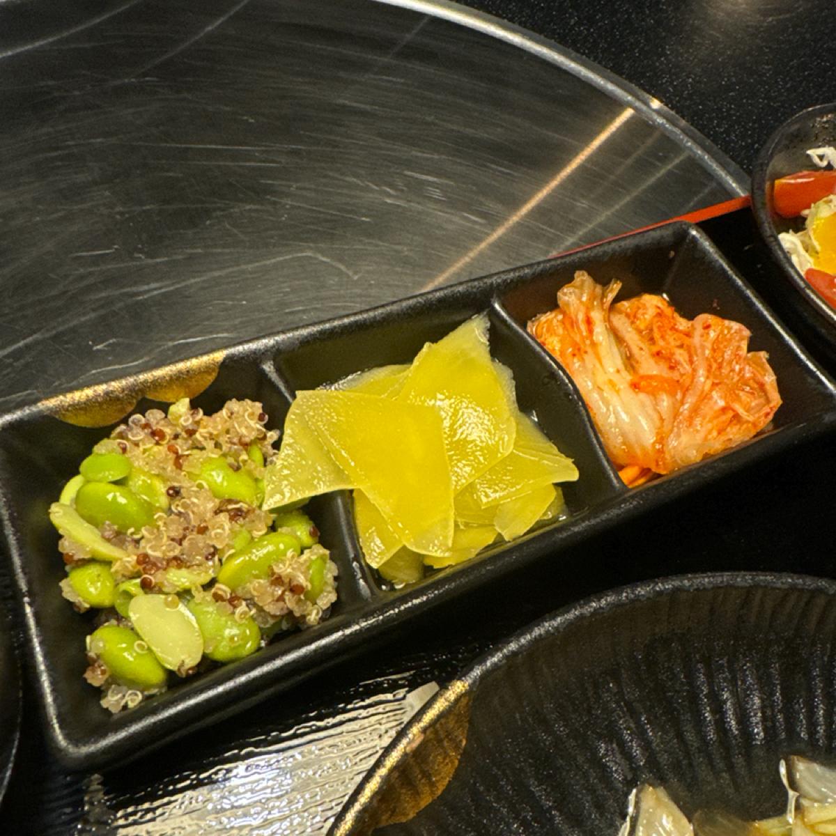 湯品的部分一開始是上蔬菜湯,裡面很多青菜番茄與豆腐。後面兩次上的是味噌湯,比較偏鹹口的,裡面有小豆腐,海帶芽跟小魚乾,兩個都不錯!