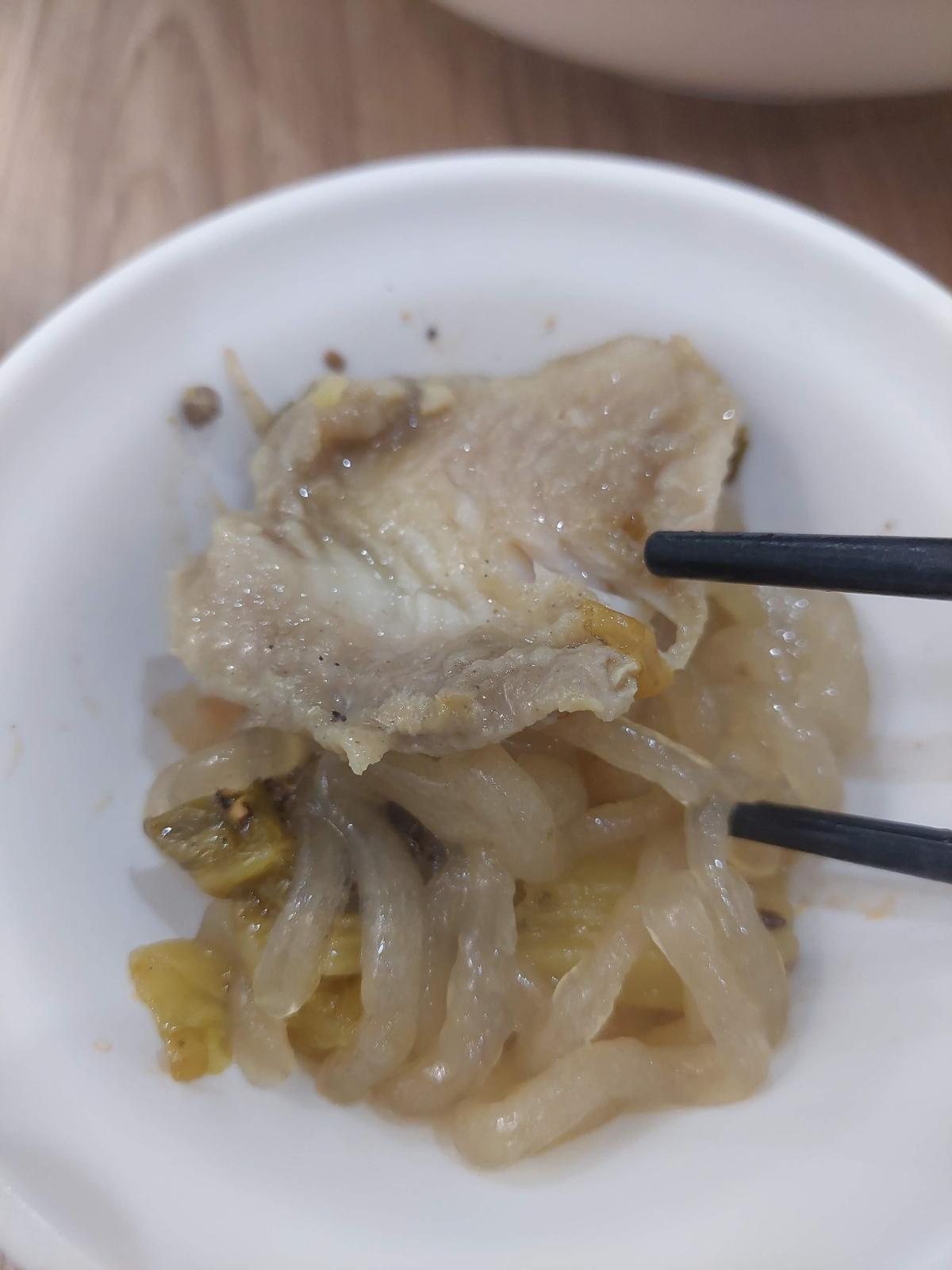 主食選擇是經典的薯粉,細滑Q彈的口感跟酸鹹的酸菜魚湯底也算是絕配了。
