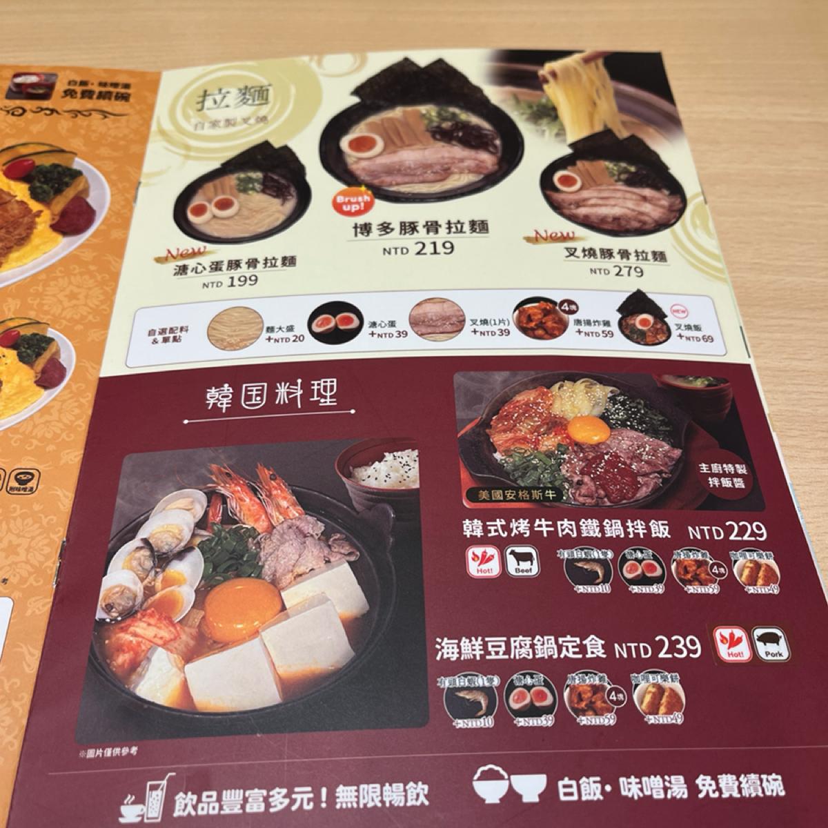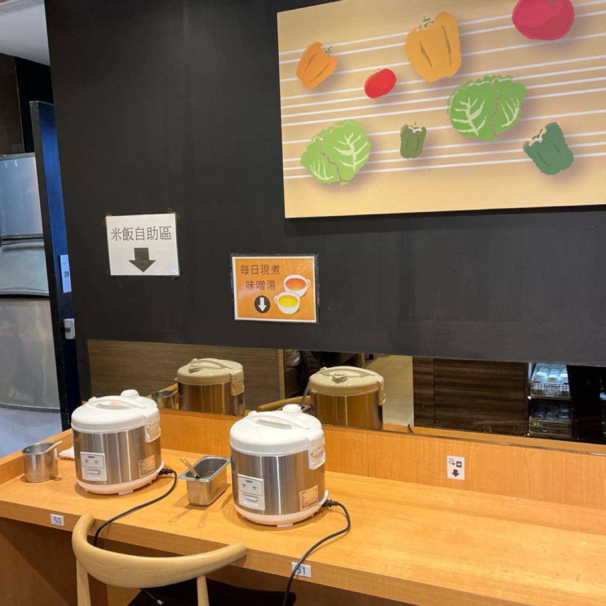 店內採線上點餐。點餐即可享用自助吧,包含無糖茶、飲料數種、水與咖啡。另外白飯與味噌湯也能裝到飽,很有日本家庭餐廳的味道。
