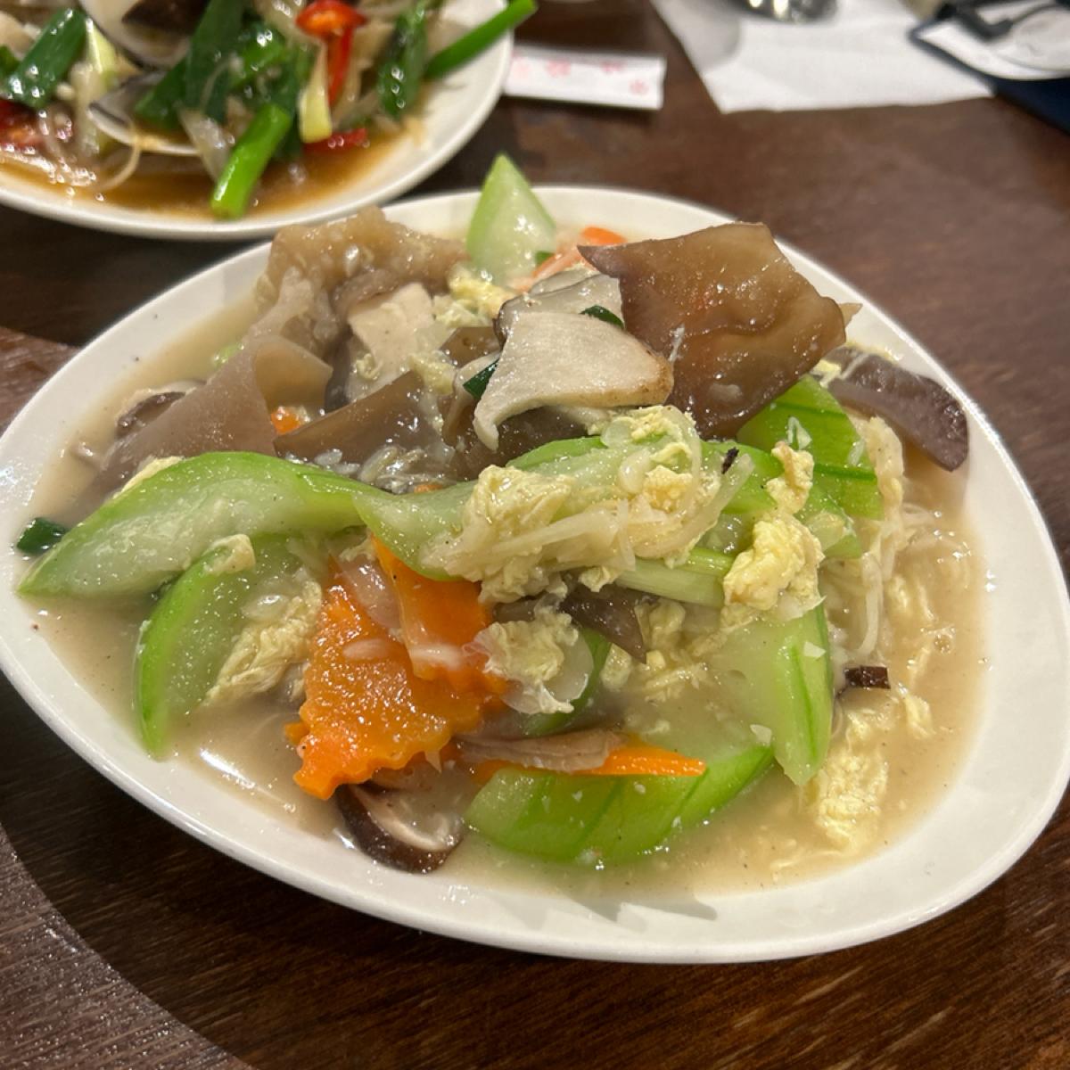 ·絲瓜炒蛋:除了絲瓜和蛋之外,還有木耳、菇類。