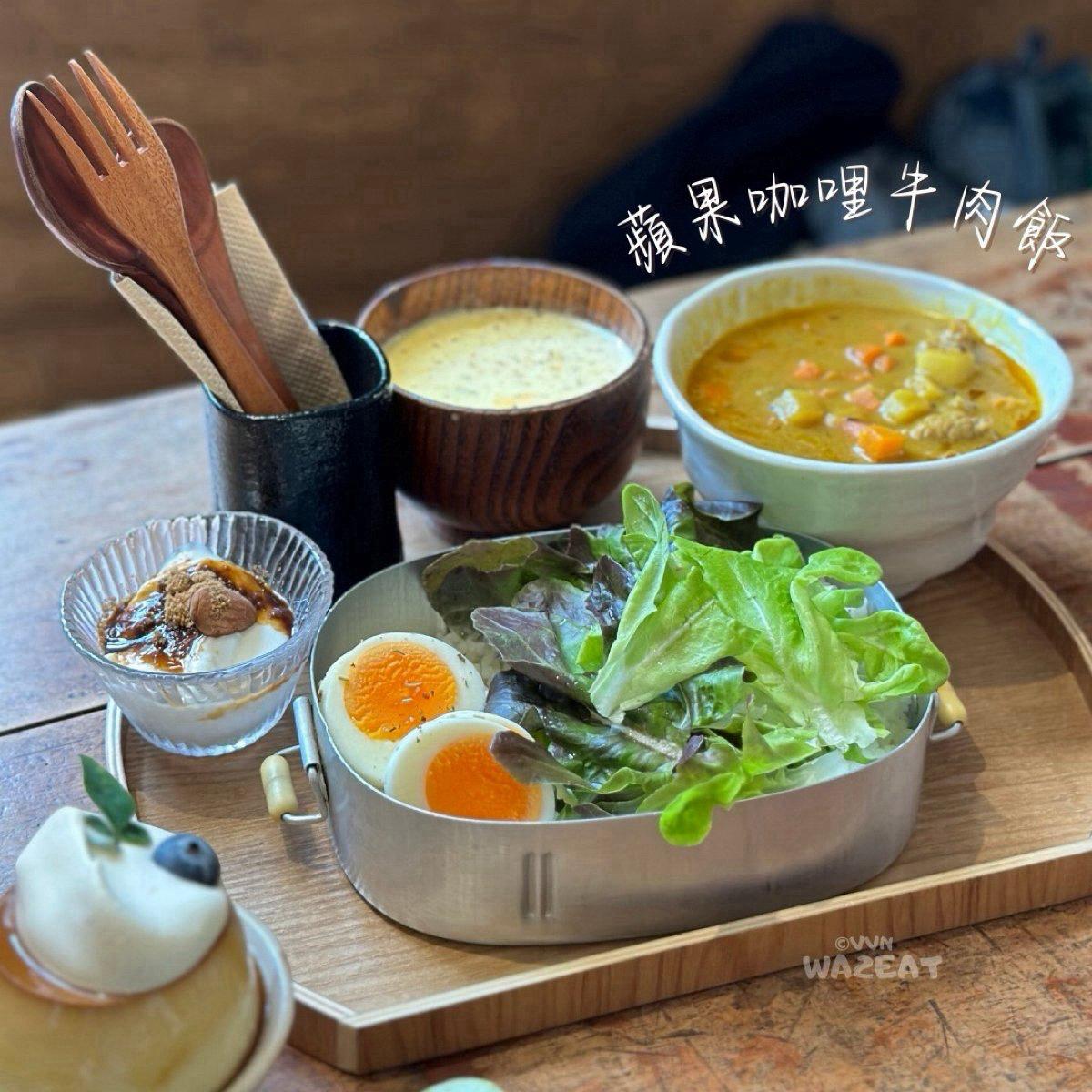 有黑糖優格,奶香滿滿的濃湯,還有兒時回憶感的鐵餐盒,裡面裝有白飯、蔬菜和溏心蛋