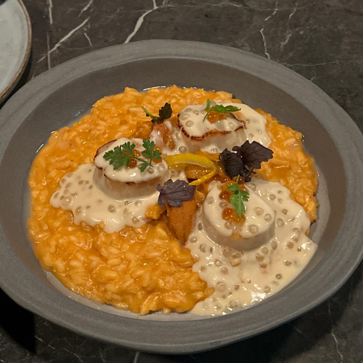 •海膽燉飯:這道菜可以加 $200 升級海膽,似乎是許多客人的推薦菜色。燉飯軟硬適中,香氣濃郁,干貝熟度剛好,口感鮮甜,海膽新鮮帶有自然甜味。不過,價格偏高且份量不多。