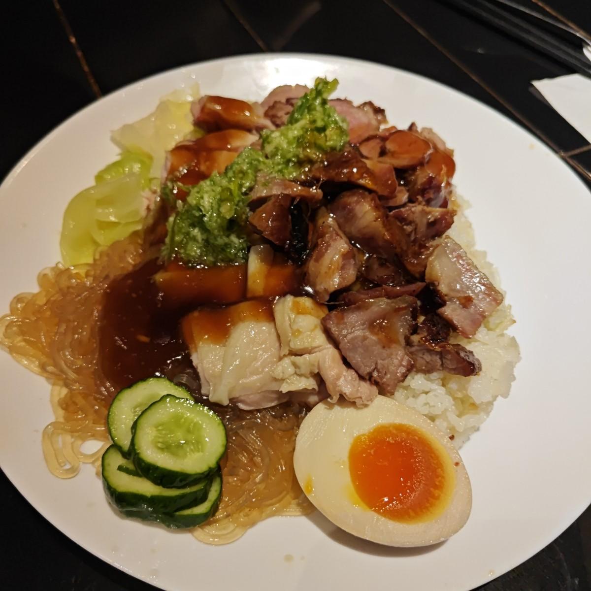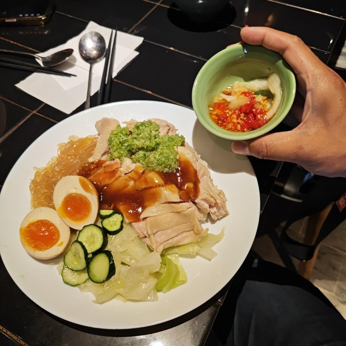 以前吃的海南雞相當的滑嫩這邊的稍微偏材 但是現場還有自助吧 提供白木耳跟熱湯、茶水 不論是叉燒或者是配菜稍稍偏甜 調味醬擺設沒有標示清楚有點搞不太清楚 尤其有一鍋看是醬油但是感覺是仙草 太多疑惑了所以就沒有去嘗試 米飯相當的好吃 應該說他的油蔥搭配不論是肉還是飯還是菜都絕配 以中山區這樣的消費個人覺得可以 有機會方便停車可以考慮再來