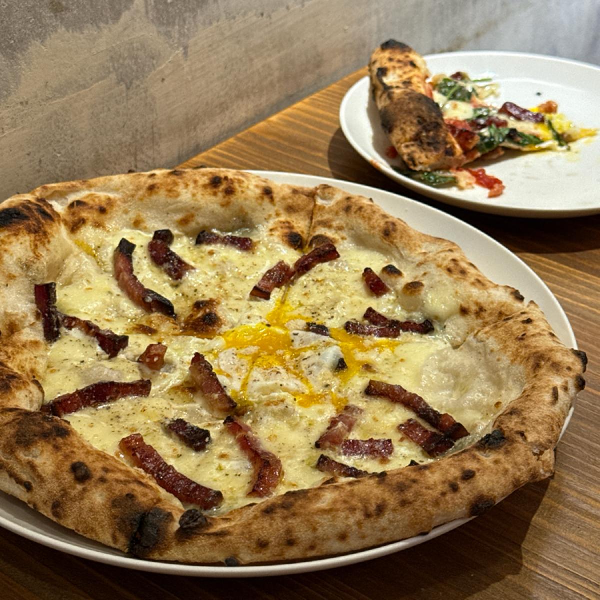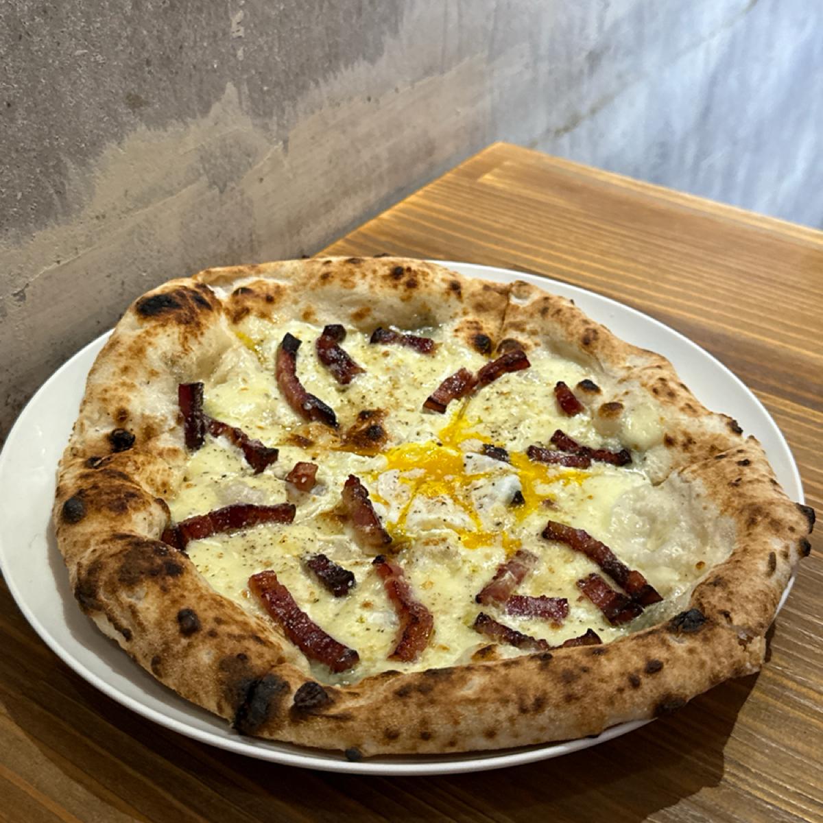 這款以莫札瑞拉、哥根佐拉兩種起司為基底,加上培根與黑胡椒、鮮奶油製成的醬料,整體風味濃郁。奶香與起司鹹香融合得很好,哥根佐拉的微苦與深度讓這款披薩大人味十足。半熟蛋的滑順感中和了醬料的濃烈,黑胡椒提味但不搶戲,是非常穩定的經典款~