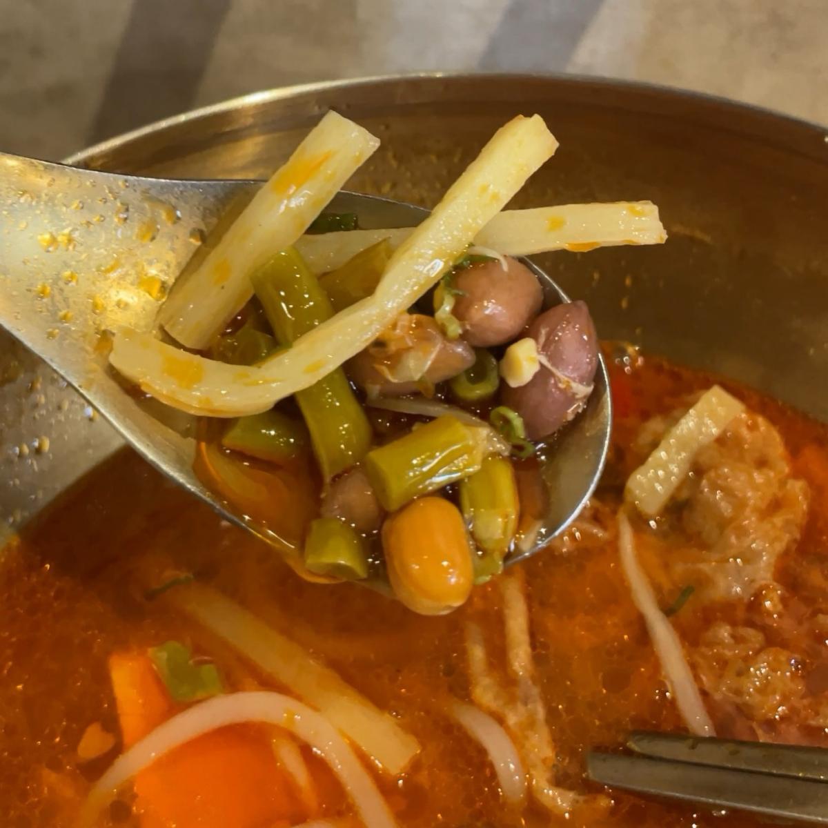 (純米米線/豆皮1/老饕酸筍1/手炒酸豆1/花生1/自製凍豆腐2塊1/甜白菜&黃豆芽1/中辣/加醋/炸蛋來了+$32/蔥花*1/不加購塑膠袋)