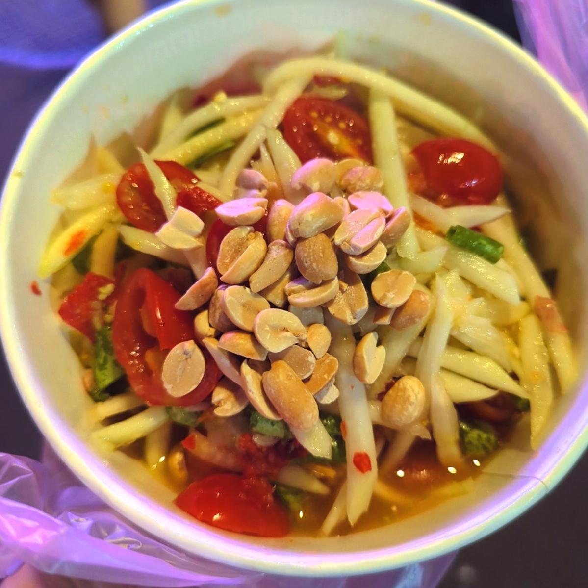 💬泰式餐廳活動第二天,馬上就想到樂華夜市內的涼拌青木瓜,也是從他剛開店吃到現在,口味竟然完全沒有變化,老闆腳不太舒服所以開店時間有時候會稍晚,且會有不定期的休息時間,所以要有撲空的心理準備。這間店一直都是涼拌青木瓜首選,因為完全純手工,就跟你去泰國吃的一樣,如果想要回味泰國口味請選擇大辣,吃完絕對口齒留香。