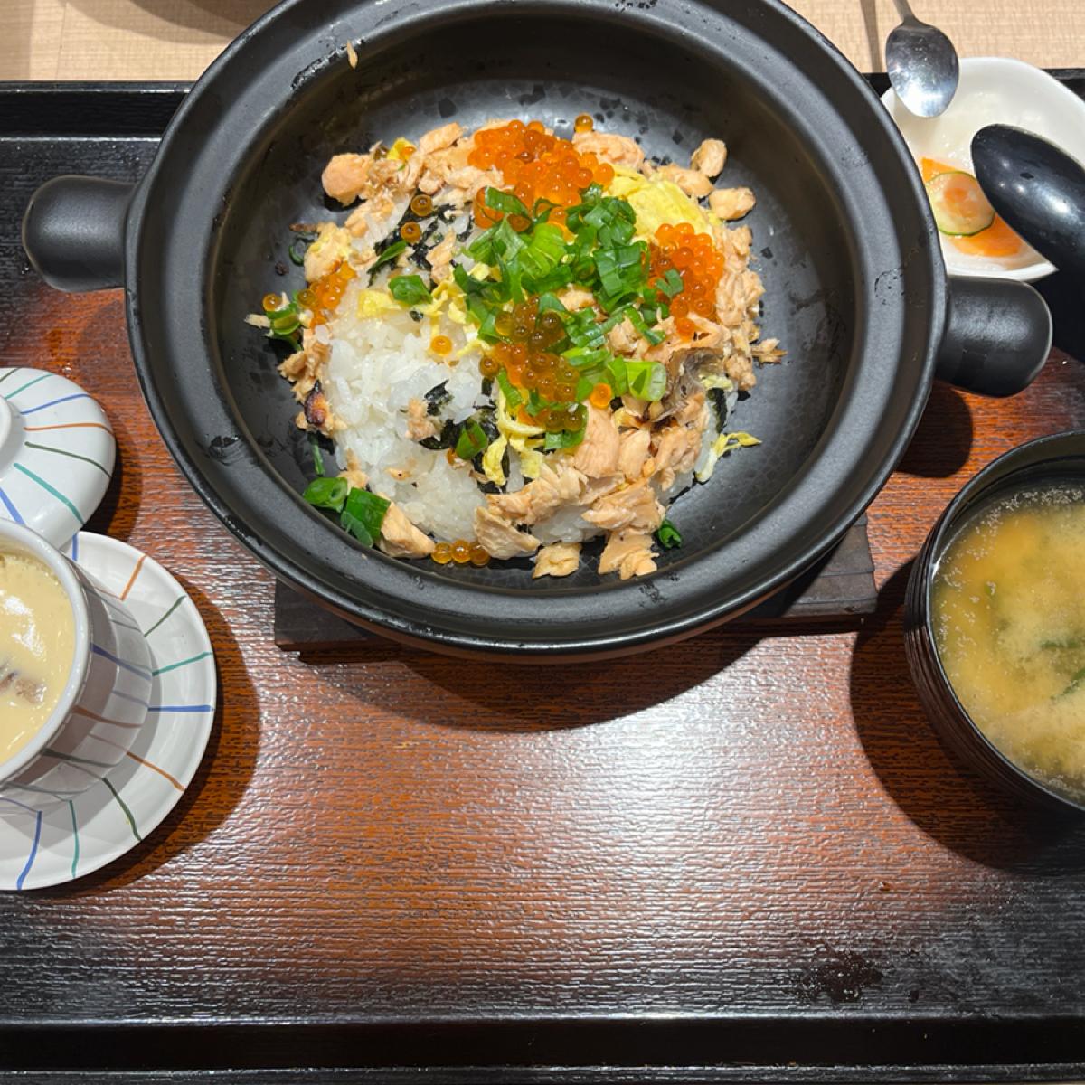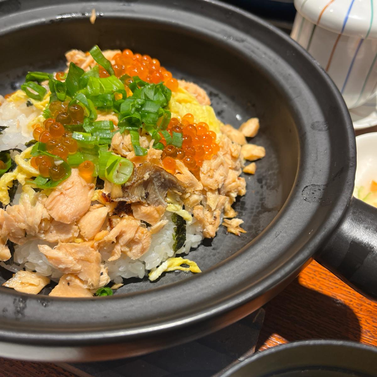 今天點了幾樣菜,以這次期間限定的鮭魚親子土鍋飯(400)分享。這道菜有附小菜、味噌湯與茶碗蒸。主菜部分,使用全熟的鮭魚與鮭魚卵,另外配上蛋絲與海苔絲,要以散壽司的樣子呈現。