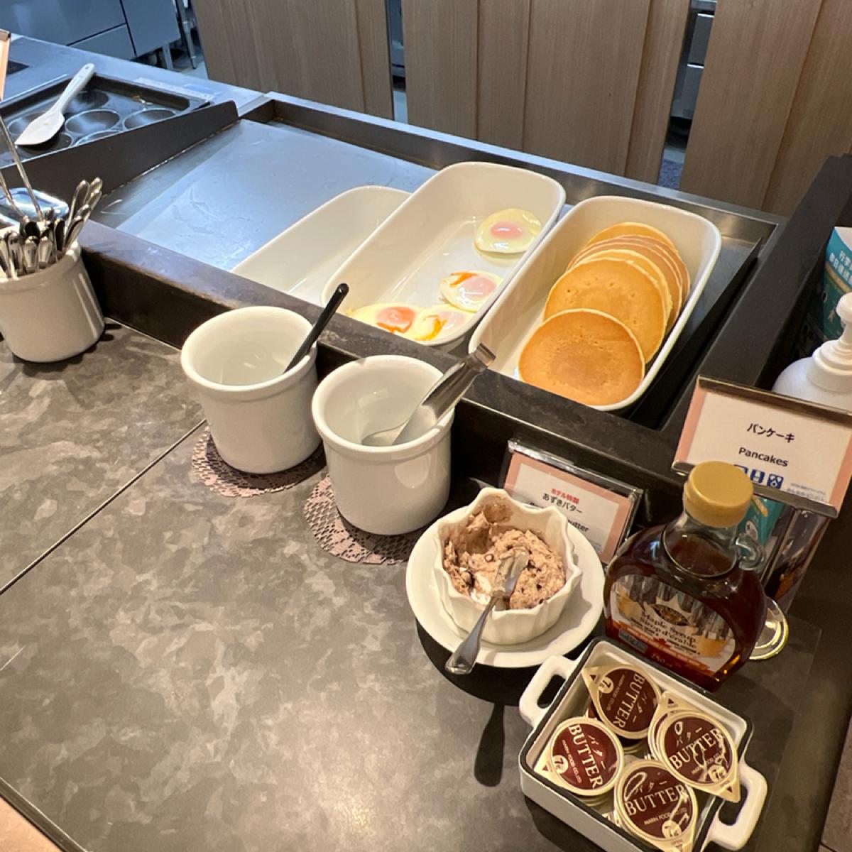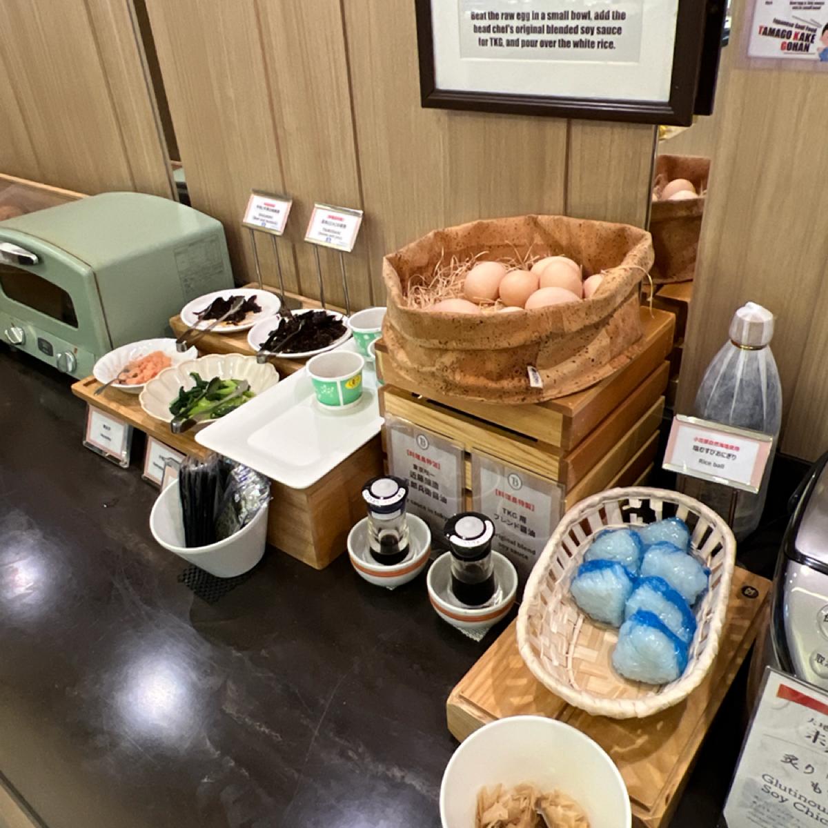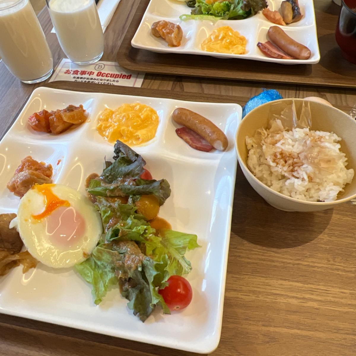 早餐供應時間是早上七點到十點,我們大約八點半左右下去用餐。用餐的空間不算寬敞,但環境簡潔舒適,餐點也頗為精緻,種類還算豐富,包括美式和日式選擇。特別推薦的是下町牛鍋,有點像壽喜燒,口味濃郁,讓人一口接一口。三角飯糰則比較普通,就是很簡單的白飯糰,沒什麼特別之處。但搭配溫泉蛋和白飯,整體味道很好。