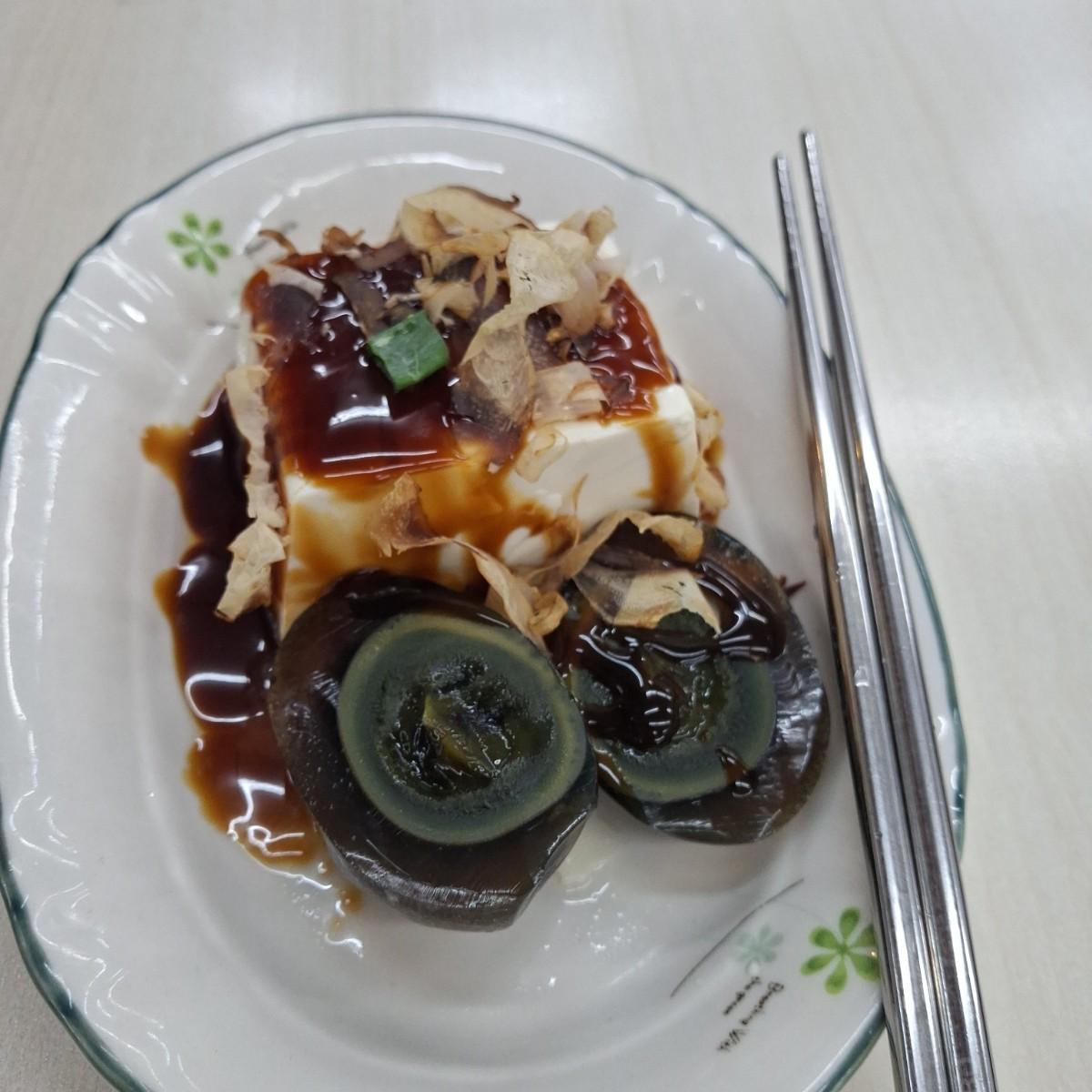 皮蛋是一整顆下去的,配著冰涼的豆腐吃很好吃,甚至有一度在思考要不要攪拌在一起🤣 但單吃皮蛋的話,味道可能有點重,這點要注意一下唷。