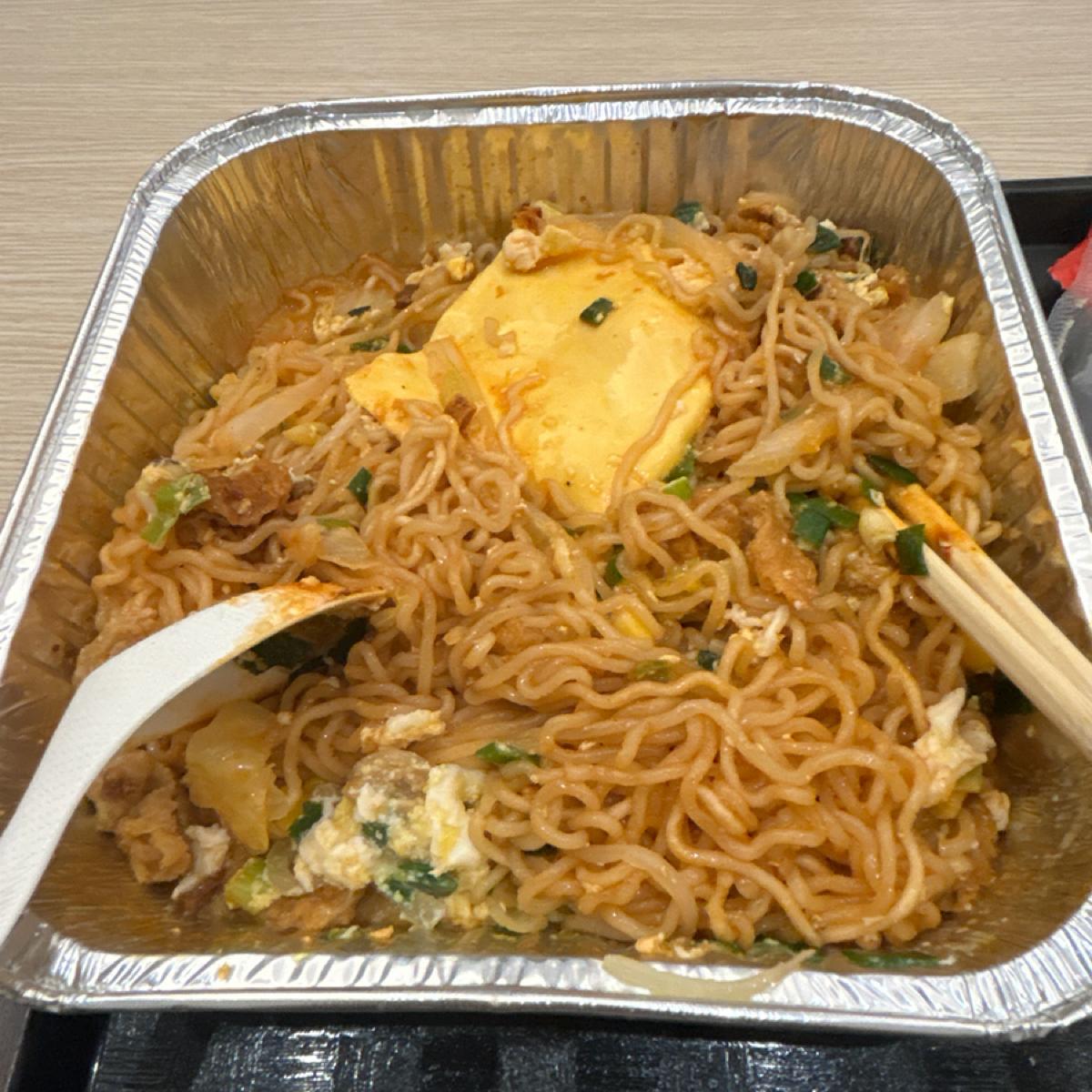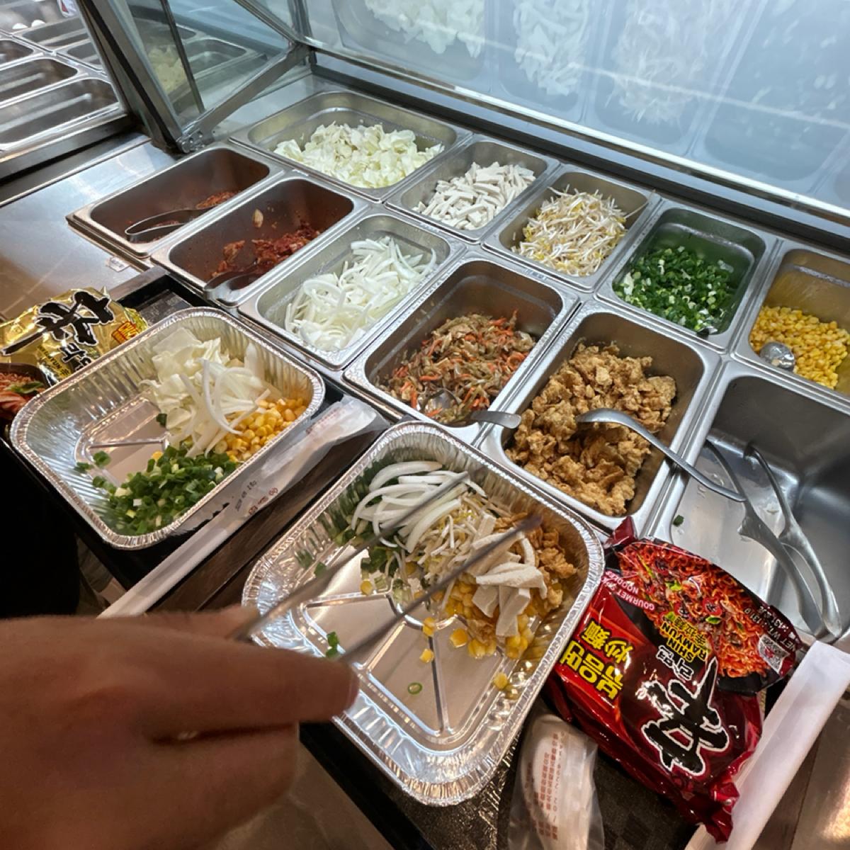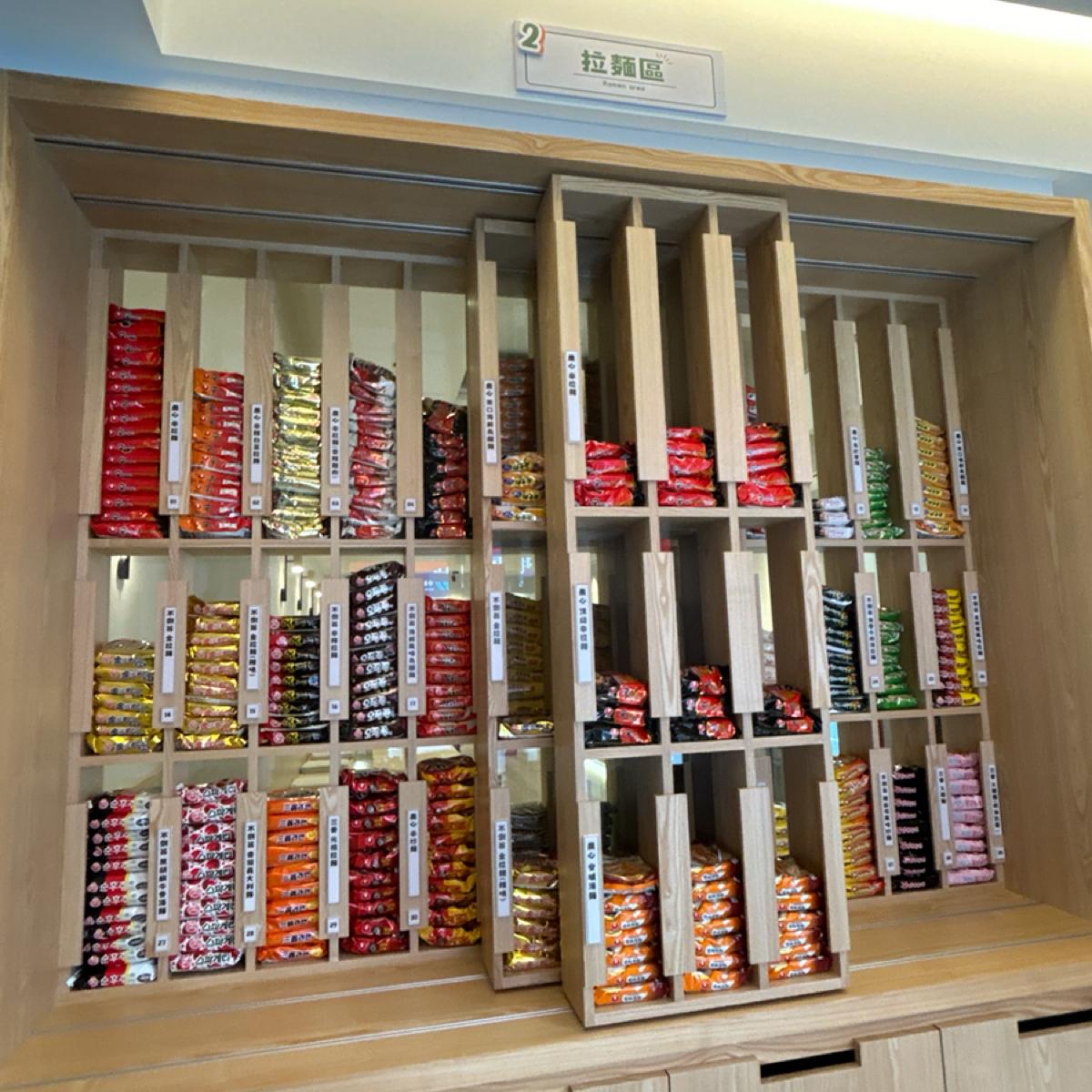 一進到這家店裡就覺得超新奇,牆上有超多不同種類、口味的拉麵,真的超酷,點餐是採用自助機台自行點餐,付完錢就可以自行拿取選購的材料囉!這次的試營運活動是Google評論打卡就贈送一顆雞蛋及一片起司,真的很讚欸!都是吃泡麵必須搭配的配料😋。