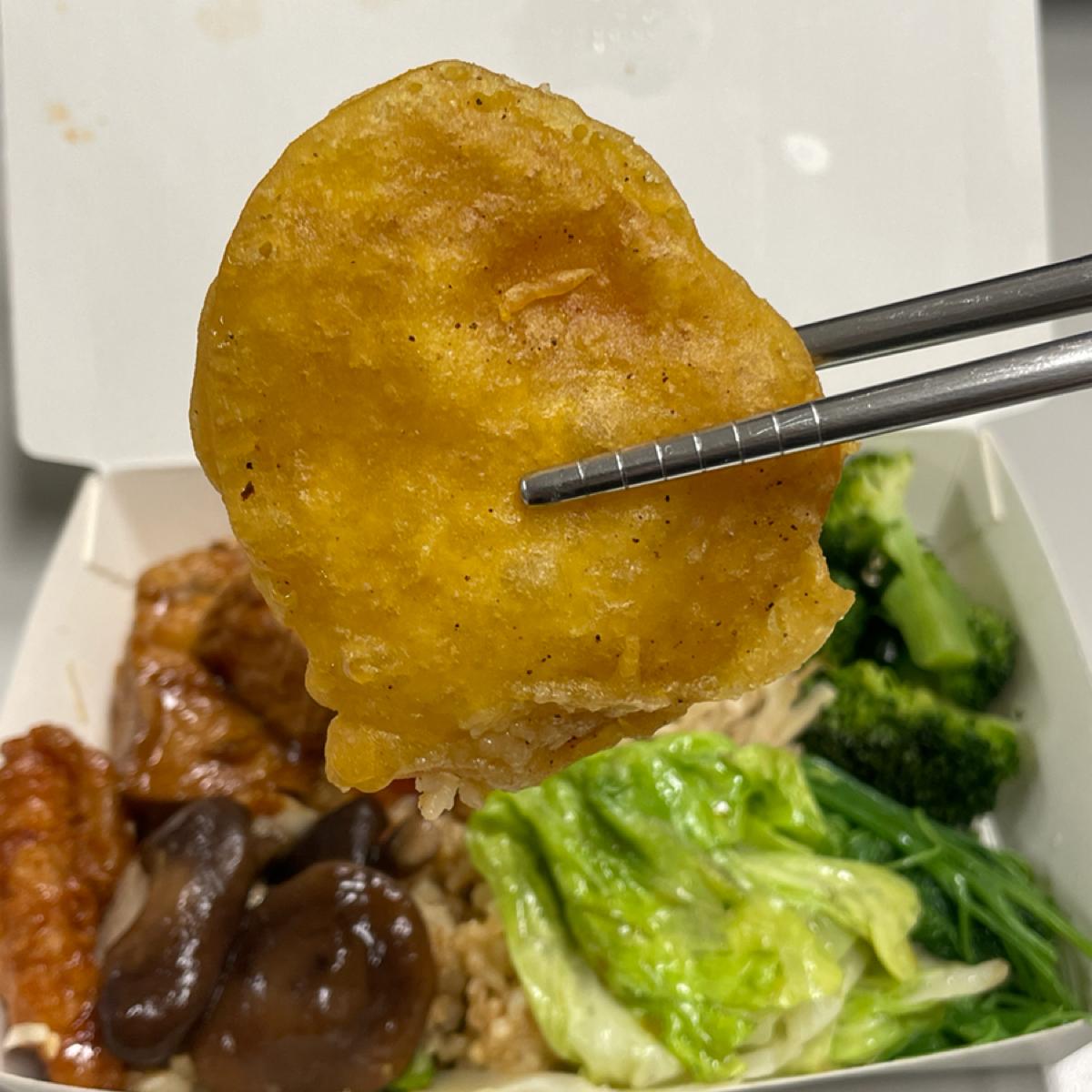 我就是看到想吃的就夾,每樣份量都不多,可能1-2口或是1-2塊這樣,品項包含:高麗菜、龍鬚菜、花椰菜、牛蒡絲、滷豆腐、炸豆腐、炒飯、蘿蔔糕、炸地瓜、香菇、不知名的素食炸物等等,最後秤重總共$104