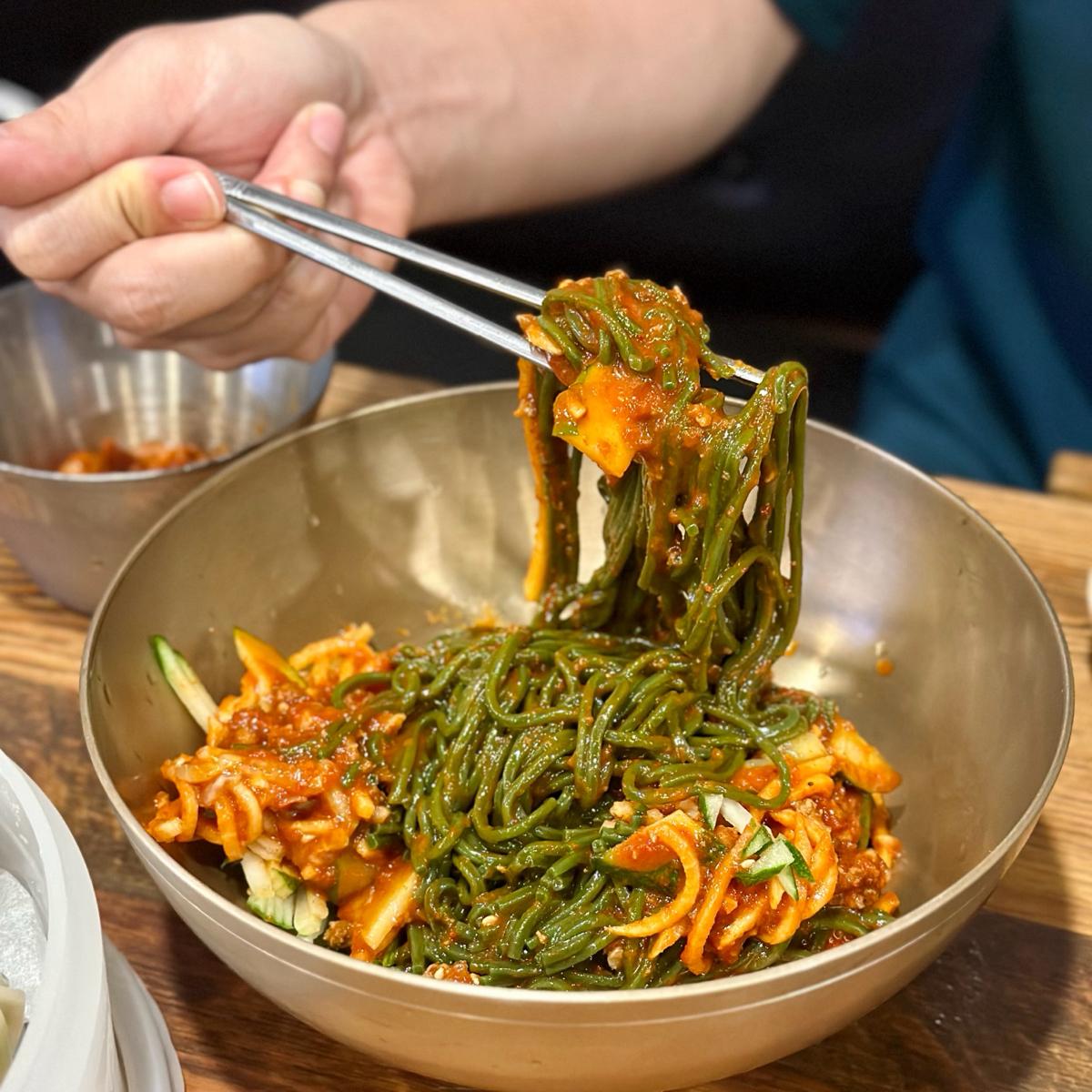 ✅拌麵:韓式冷麵的一種。之所以麵條呈現綠色,是因為店家在裡面添加了綠藻。這些麵條本身沒有特別的味道,但口感非常有彈性。搭配店家提供的韓式甜辣醬,味道帶有韓式甜味,但不太辣。
