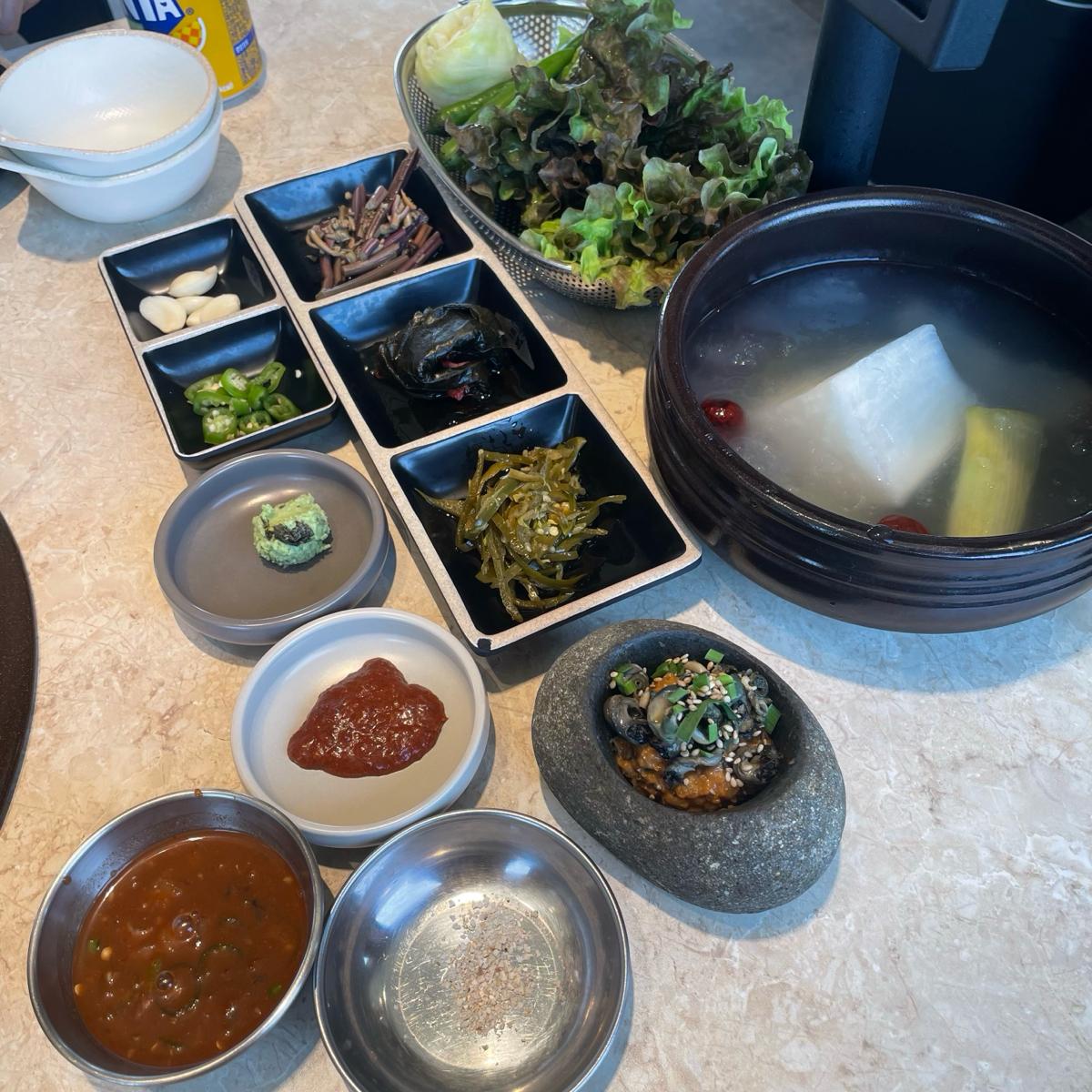 另外還有一鍋冷湯,裡面放了超大一塊的醃蘿蔔,不知道是要自己剪還是怎樣,湯喝起來有點像冰的醃菜湯,總之不太合我們胃口,我們就沒動了