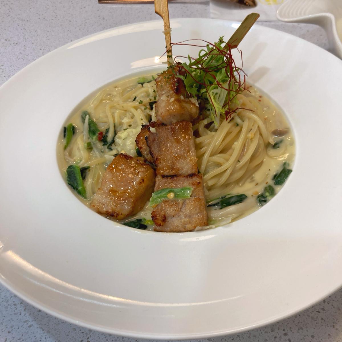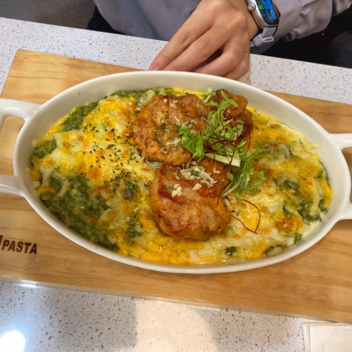 整體來說好吃,主食選了看起來特別的奶香菠菜串烤嫩豬義大利,烤嫩豬不會乾,肉質嫩又多汁,而且肉的份量也不少,奶香味濃郁,義大利麵有入味。青醬香酥嫩雞焗飯份量很大,飯很多也有入味,算好吃,香酥嫩雞雖然是炸雞,但也是多汁鮮嫩不會柴,而且很大塊很過癮。