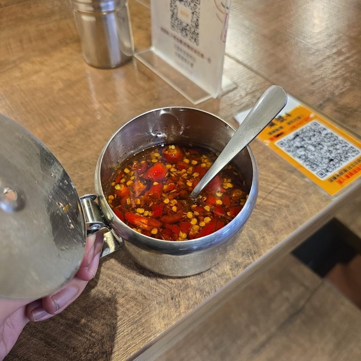 店內提供的銷魂辣椒相當美味,浸泡著新鮮辣椒的紅油,除了辛辣還帶些果香。