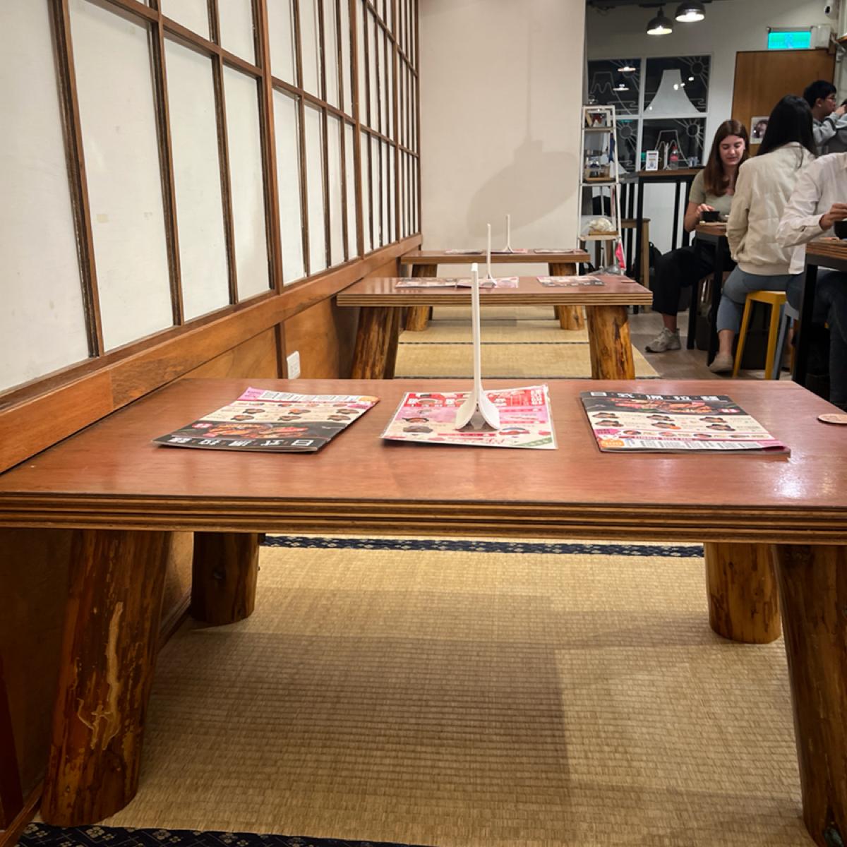 這是素食店,點餐才發現🤣 有低消150,特別的是有榻榻米座位區ㄧ排,要自行收餐具