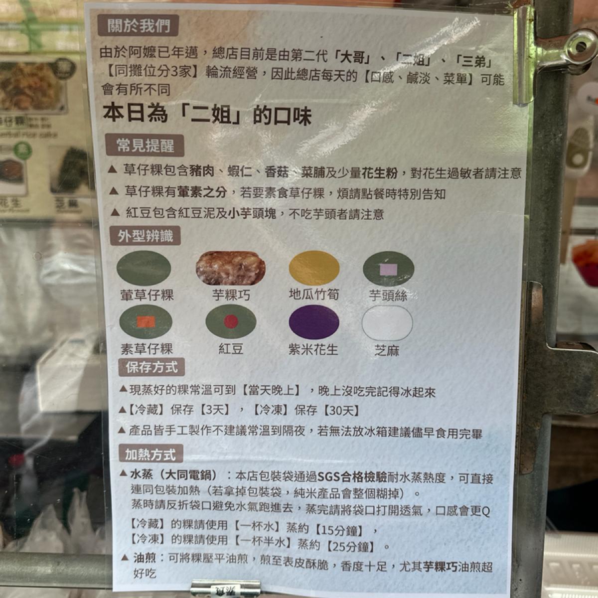 菜單有8種口味每顆都是💰35,葷/素草仔粿、芋粿巧、地瓜竹筍、芋頭絲、紅豆、紫米花生、芝麻。