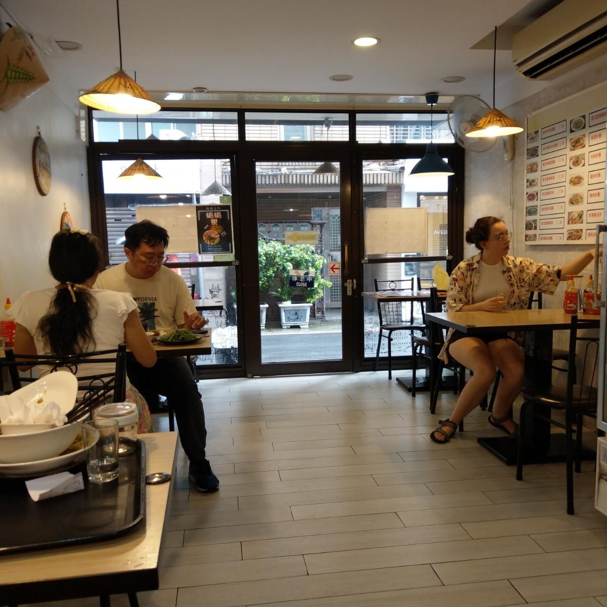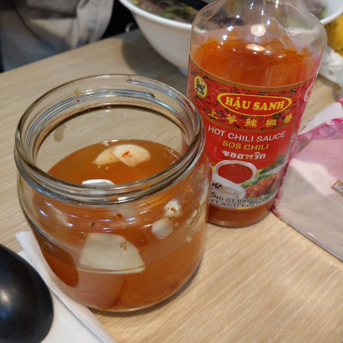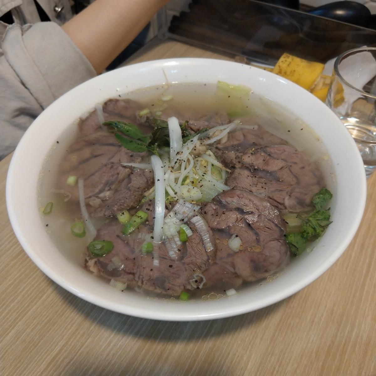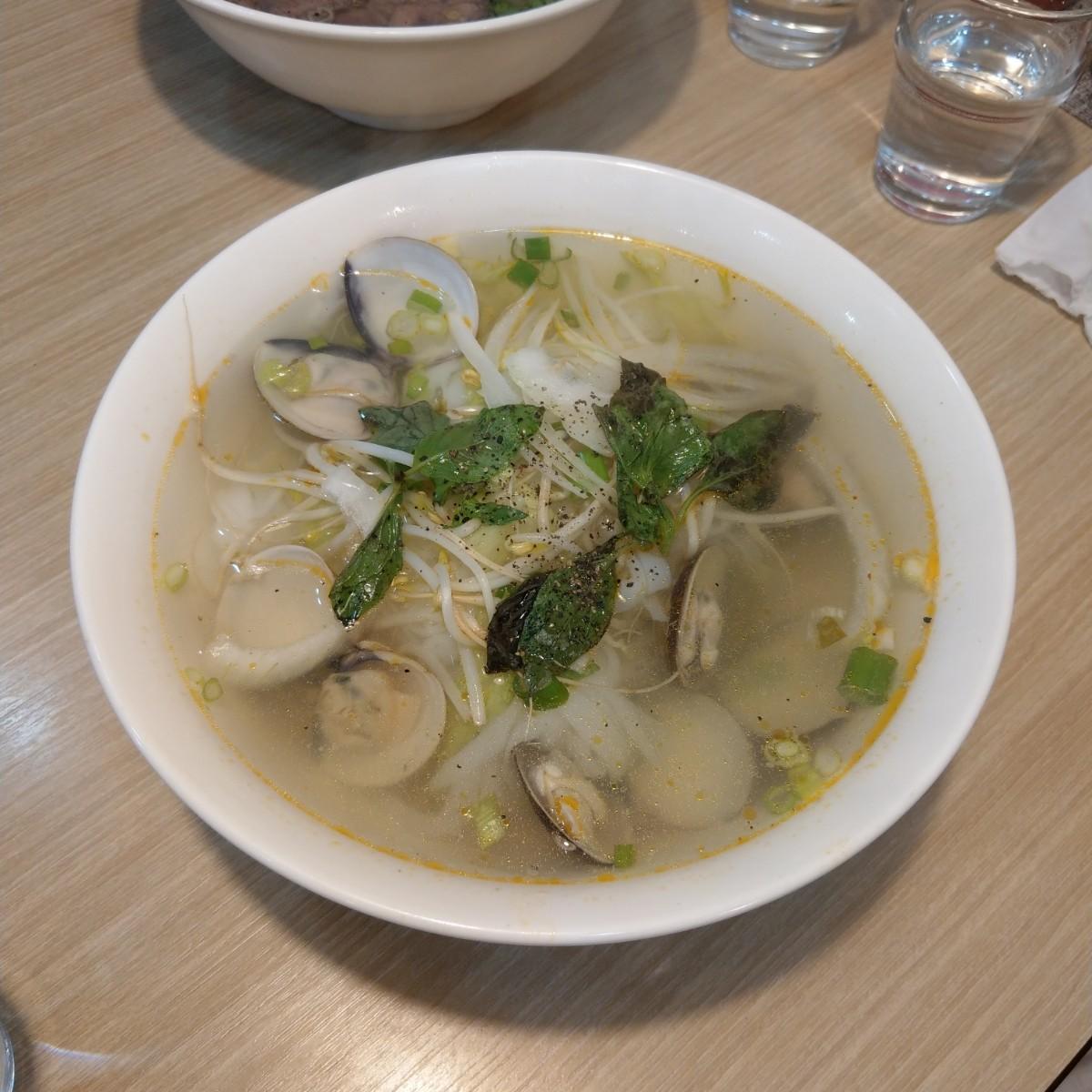 我點的是越式蛤蠣湯麵:清甜的湯頭佐洋蔥、豆芽與九層塔葉,搭配略有嚼感的河粉,蛤蜊很大但只有4-5顆,份量十足女生可以吃飽,喜歡重口味推薦再加佐料(蒜頭魚露與辣椒醬),我吃清淡只加了檸檬(旁邊有切好的小塊自己擠),湯頭再加酸酸的個人很喜歡。