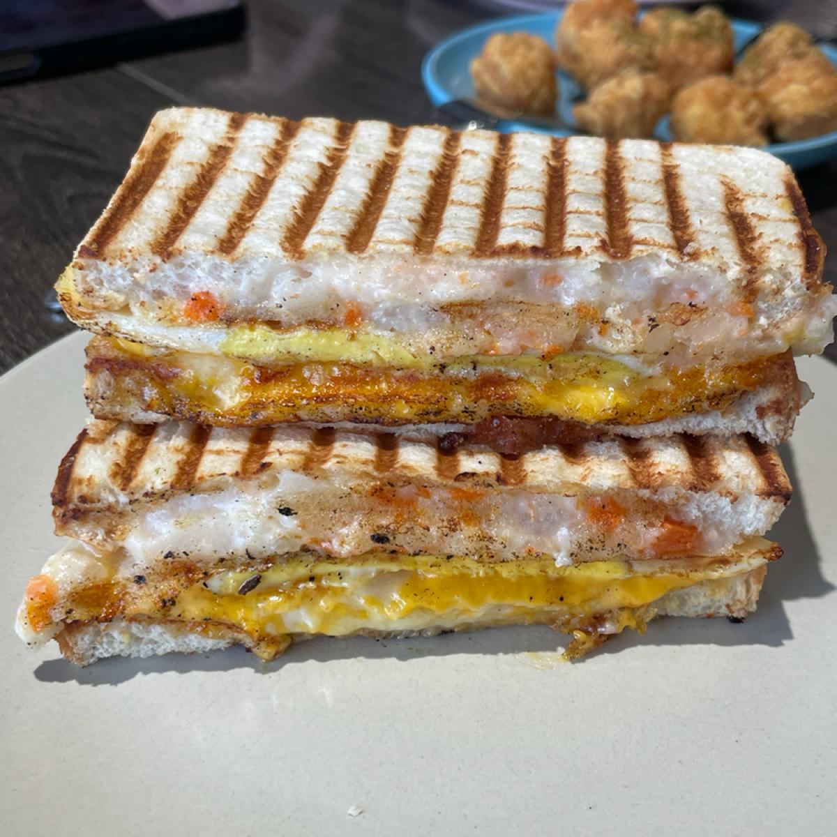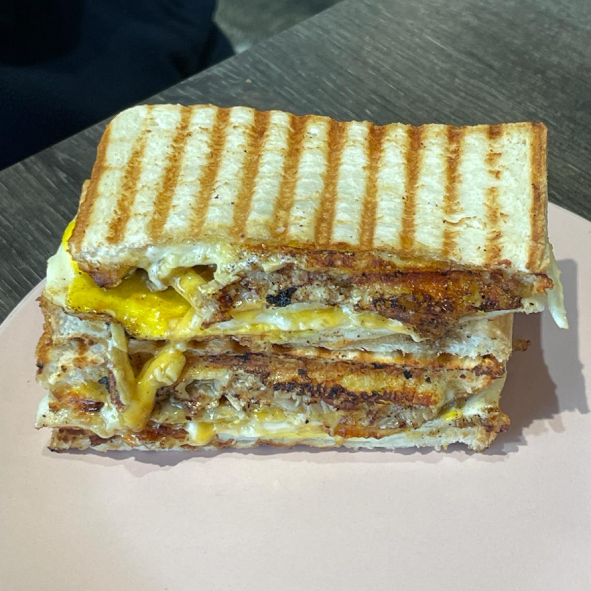 是比傳統早餐店漂亮的早餐店,空間明亮環境乾淨,但桌子跟桌子間距離有點擠,用QRcode點餐,低消150元,餐點有許多品項,漢堡、手捲、熱壓吐司應該算是招牌(?),口味選擇不少,名字取得蠻有趣。