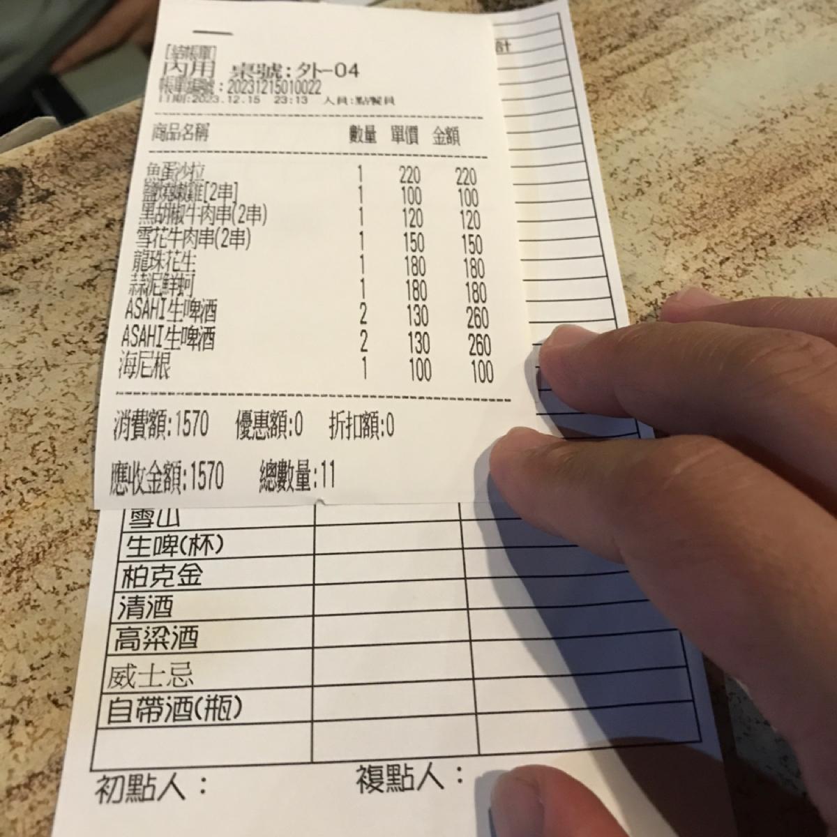 1570扣掉酒錢620,其實一個人花不到500元,他的東西有新鮮,不管是烤的還是海鮮類的都有一定的水準,當然宵夜場就是喝酒🍺,生啤酒,一杯130,要不是酒促優質,我朋友也不會叫一瓶海尼根😂,她說要下班了捧場一下😅,東西真的不錯吃,肉串有入味,該脆的有脆該嫩的有嫩。推一個。