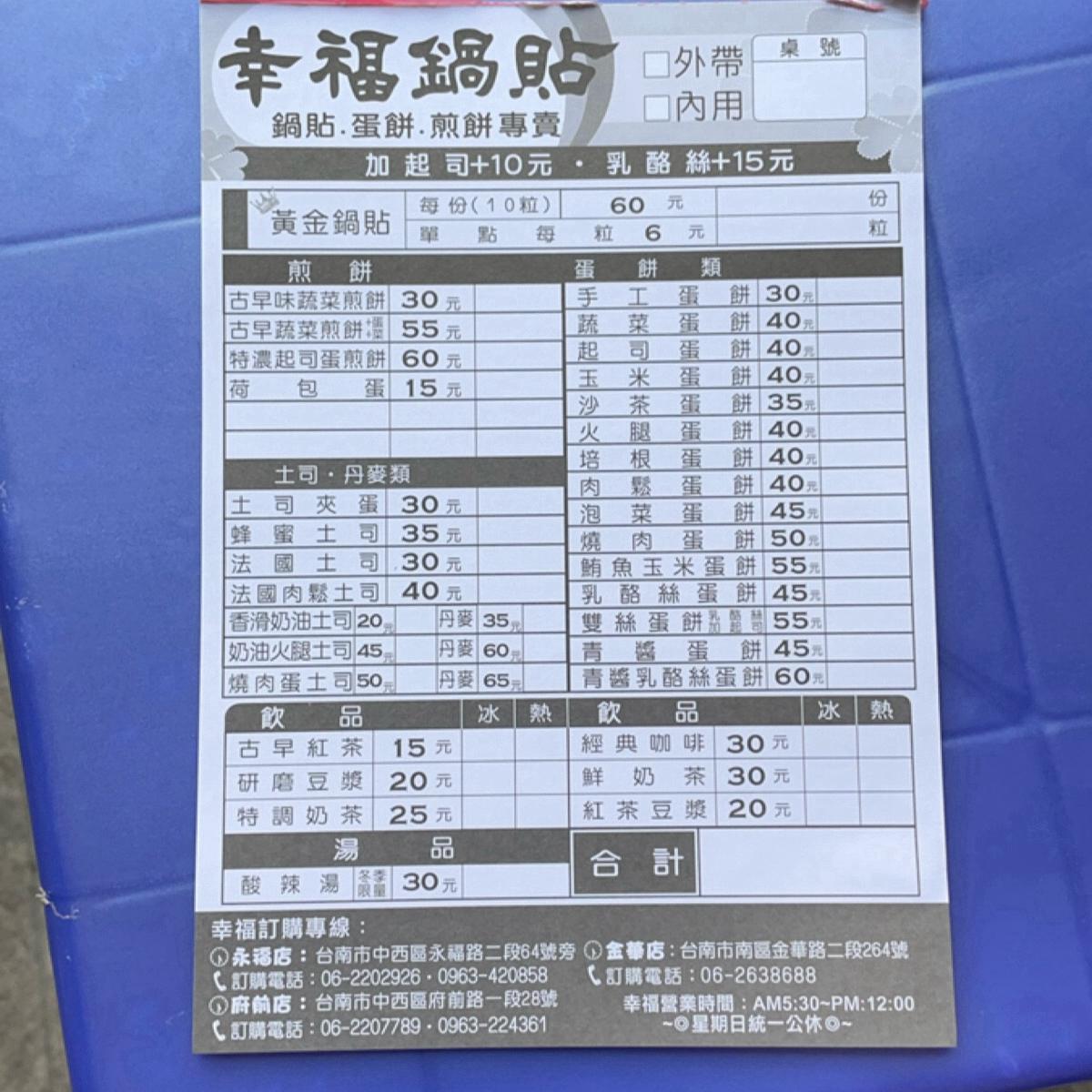 我一直以來都很喜歡吃蛋餅和餃類,這家店可以兩個願望一次滿足,所以到台南的第一頓早午餐就決定來幸福鍋貼,招牌的古早蔬菜煎餅及黃金鍋貼各來一些