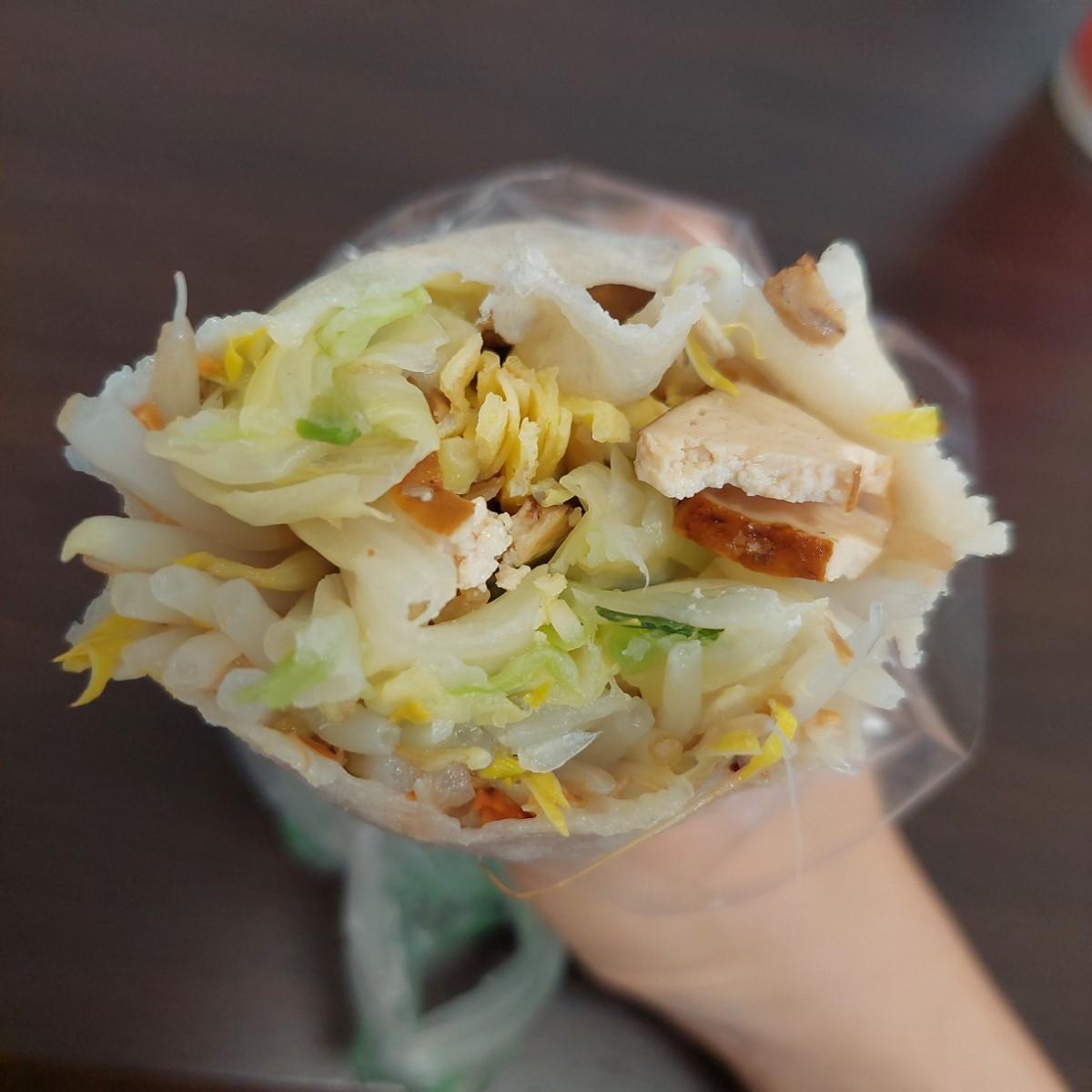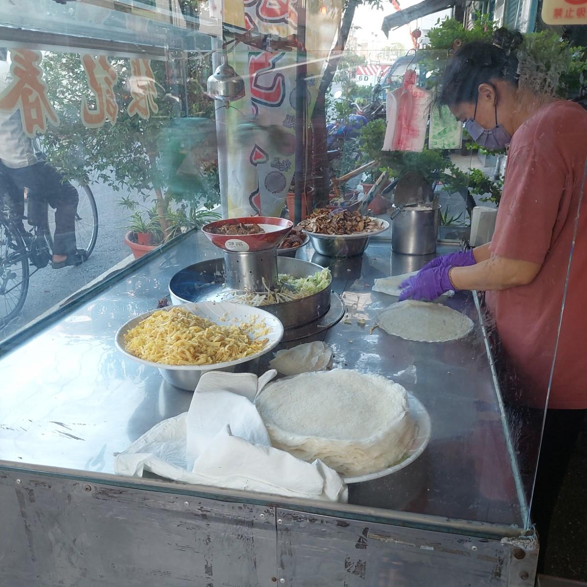 這家店位鄰近橋頭菜市場上,應該也是一家老店了,在上學時偶爾很懷念在家鄉吃到春捲,決定來老街附近尋找春捲蹤影,雖然在這找到口味可能有所不同,但我還是抱著期待心情買了這一間春捲,它跟我在網路上看到的南部春捲不太一樣,聽說南部春捲會加上油麵,但這家並沒有,配料只有豆干、高麗菜、豆芽菜、香腸、滷肉、蛋絲、糖粉、花生粉,還好沒有加上油麵感覺熱量會挺高的,我也告知老闆娘我要少點糖粉(半糖左右)沒告知的話就是正常糖,整體吃起來就健康許多,不會太甜(本人不是螞蟻人),蔬菜部分應該是用水煮方式烹調,吃起來挺清爽,沒有炒過味道,這樣一份我覺得還行,吃完大概8分飽,雖然跟我在老家吃的味道差蠻多的,但也蠻好吃的,這樣一份65不知道是貴還是不貴,對我來說食物好吃又能填飽肚子我就覺得值得了