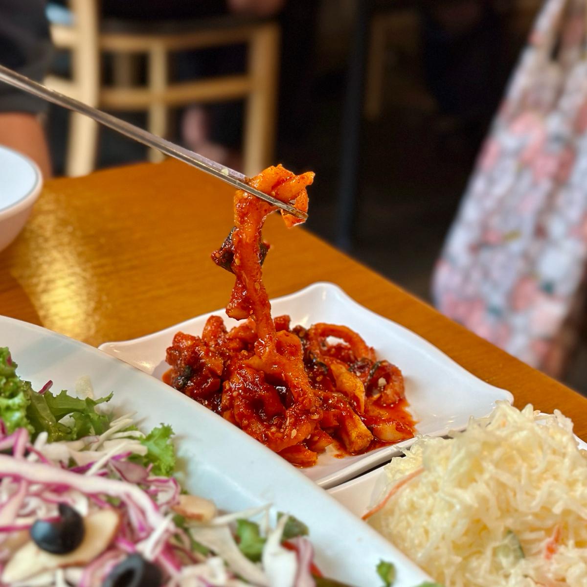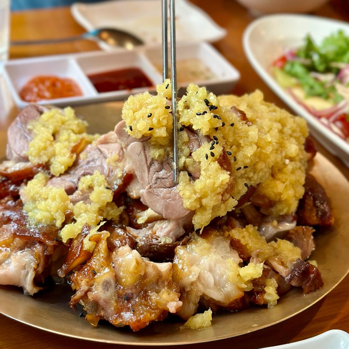 ✅Real Garlic Jokbal:一道以蒜味為主的豬腳料理。這道菜將豬腳覆蓋上滿滿的蒜蓉醬和芝麻,不僅能去除豬肉的腥味,還增添了香氣。蒜蓉醬的味道溫和,不會感到辛辣,也不會在嘴裡留下蒜味。豬腳皮非常入味,與蒜蓉醬搭配,整體口味偏甜。此外,點任一道主餐都會附送小菜、生菜沙拉和泡菜湯加麵。泡菜湯上桌時已經含有泡菜,加入附送的麵條和豆芽後,變成豆芽泡菜湯。湯的味道可以想像,而手工拉麵令人驚艷,煮熟後的麵條韌性十足。