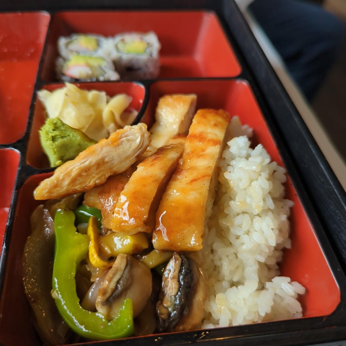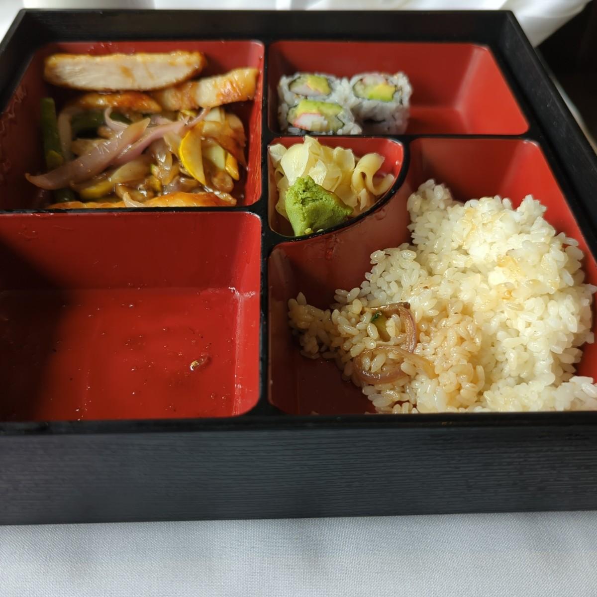 照燒雞午餐放在四方食盒中。配菜不少,有餃子,加州酪梨壽司,...。雞肉雖非燒烤,但調味得宜。吃得我津津有味,口齒留香。