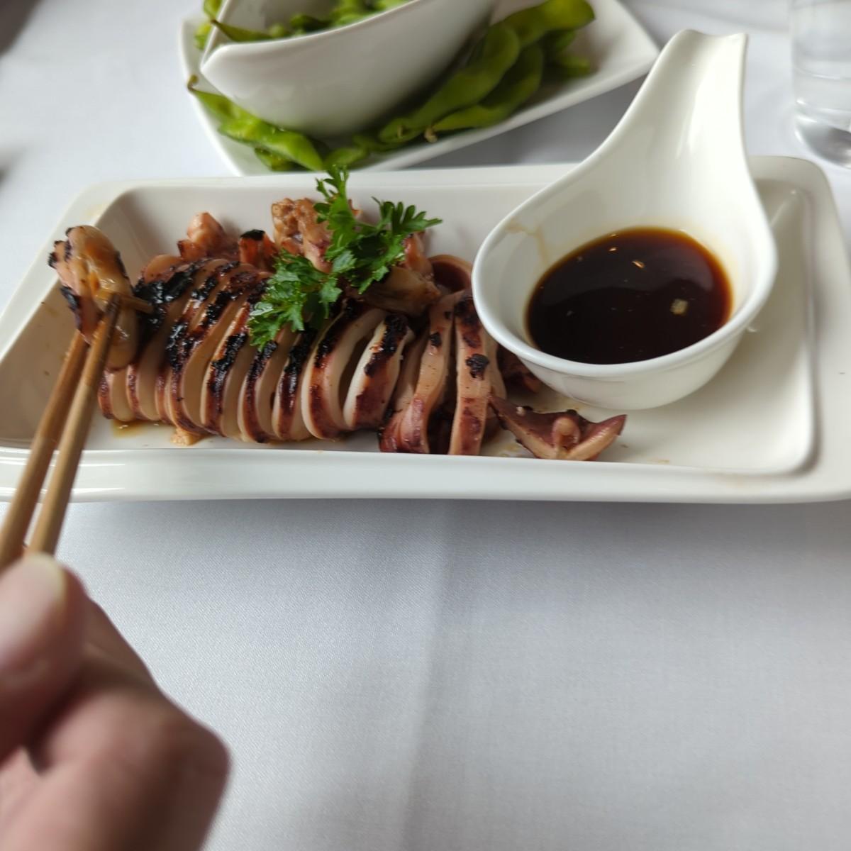 烤魷魚端上來了。我看著筷子巧妙地放在折好的餐巾內,宛如折紙(origami),就先拍照研究。