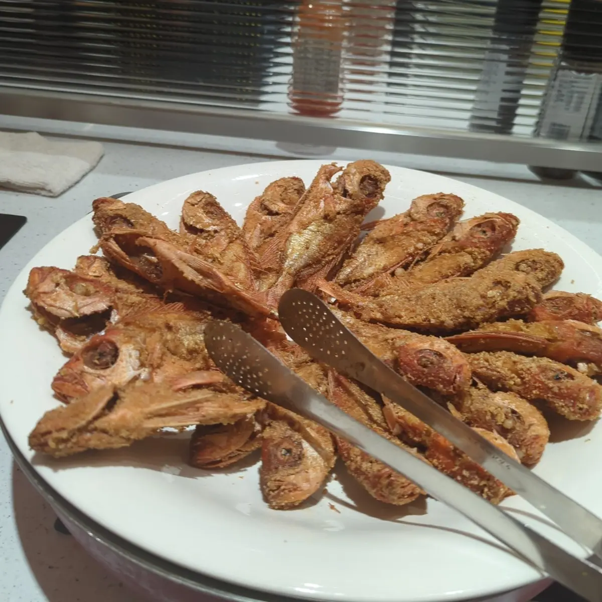 (1)香煎魚: 小條全魚(有頭有尾)煎得十分酥脆, 特別好吃. 我拿了兩次.