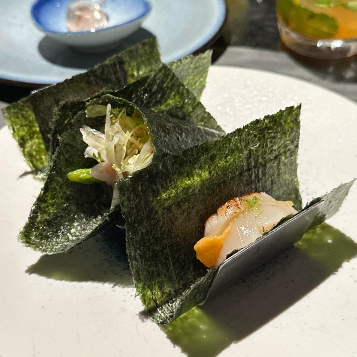 超大顆的生食級干貝,中間切開加入海膽,再以現場炙烤過的海苔包覆,吃起來非常爽口滿足,且絲毫沒有按點腥味!
