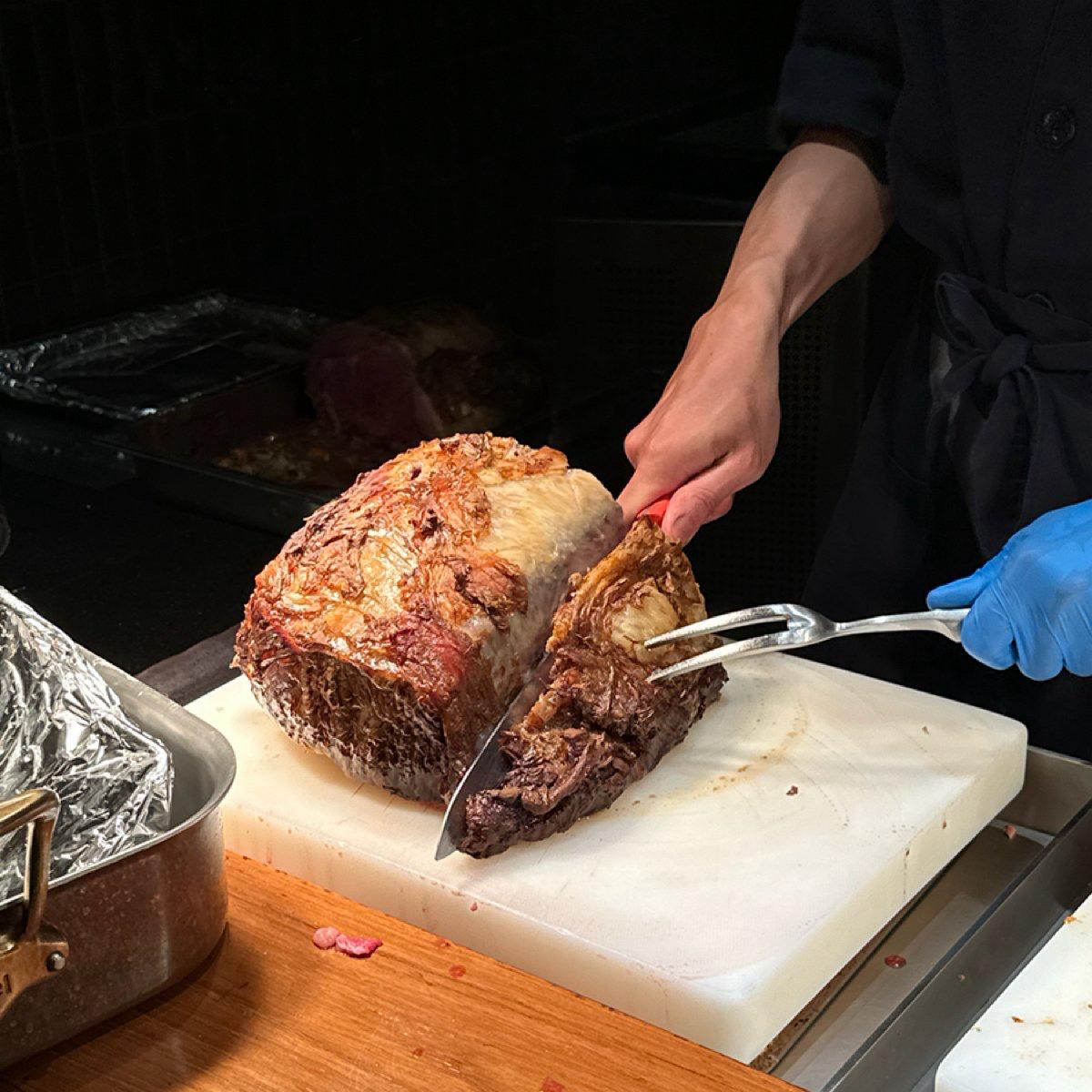 烤牛排跟豬肋排都是師傅現切,可以一次指定要多少片。烤牛排蠻不錯的,肉塊切開呈現粉紅色不會過老過熟,師傅還會很貼心把比較肥的地方修掉,吃起來軟嫩鮮美;豬肋排的部分我覺得稍嫌失望,烤醬沒有很入味,而且豬肉與肋骨的部分沒有一入口即剝離的爽感,感覺完成度沒那麼高。