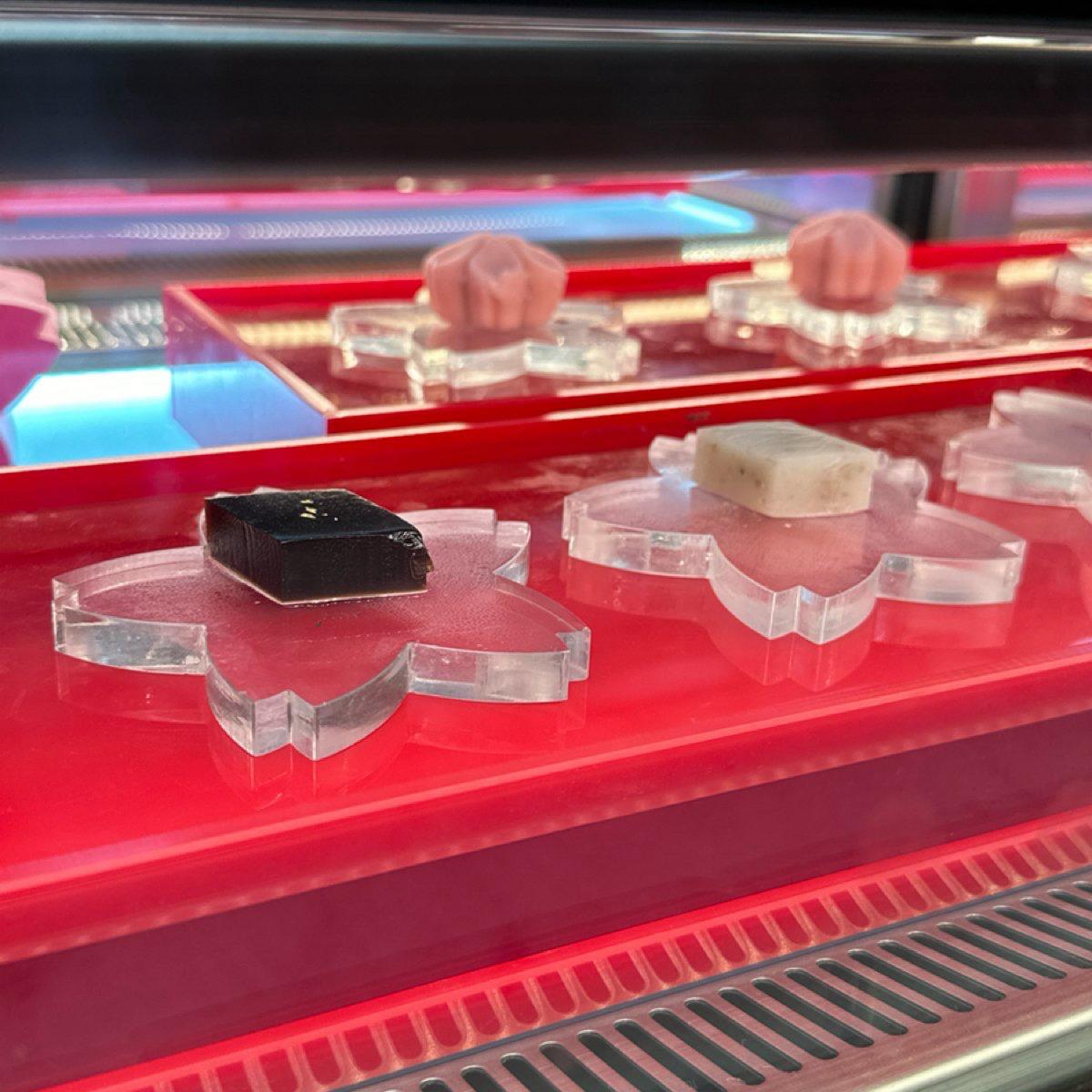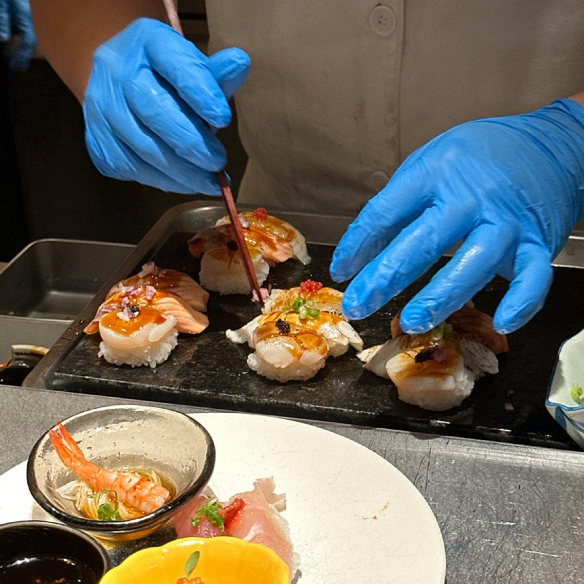 這區皆為師傅現做的握壽司,櫻花鯛魚、和牛、鮭魚肚、鰤魚、蟹膏干貝跟比目魚鰭,一次可以選三種壽司,可以重複選擇沒關係,我是選了干貝、鮭魚及鯛魚,師傅在每種不同的握壽司上都會佐以不同的小調味,視覺跟味覺都到不同多樣的層次感,覺得完全不輸外面的單點壽司,直得排隊多次享用。