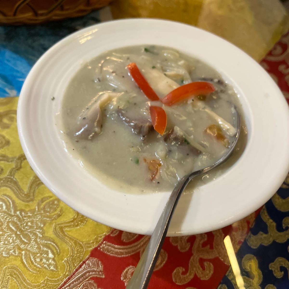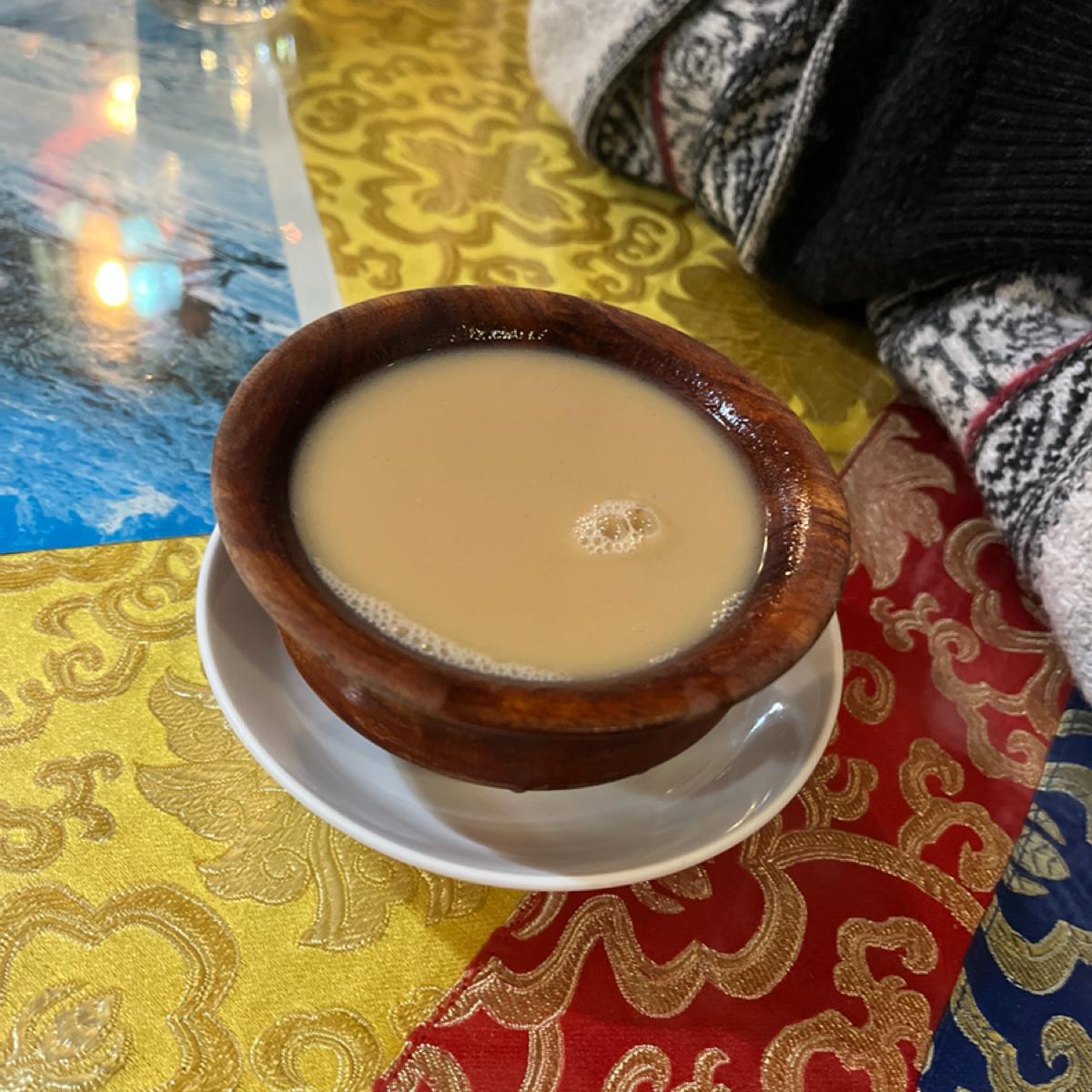 酥油茶 是經典藏式飲品,入口帶著奶油與鹽味,和台灣常喝的甜奶茶完全不同,喝起來有點像鹹奶湯,風味樸實厚重,很有高原飲食的特色,適合小口慢慢品嚐。