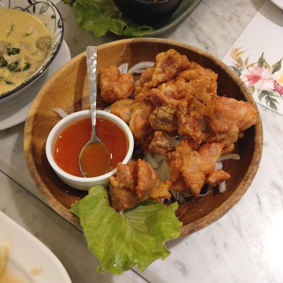 魚露炸雞:價位最高的一品,上菜速度也是最慢的。炸雞的皮略厚,肉咬起來有點乾硬,醬料味道普通,不怎麼推。