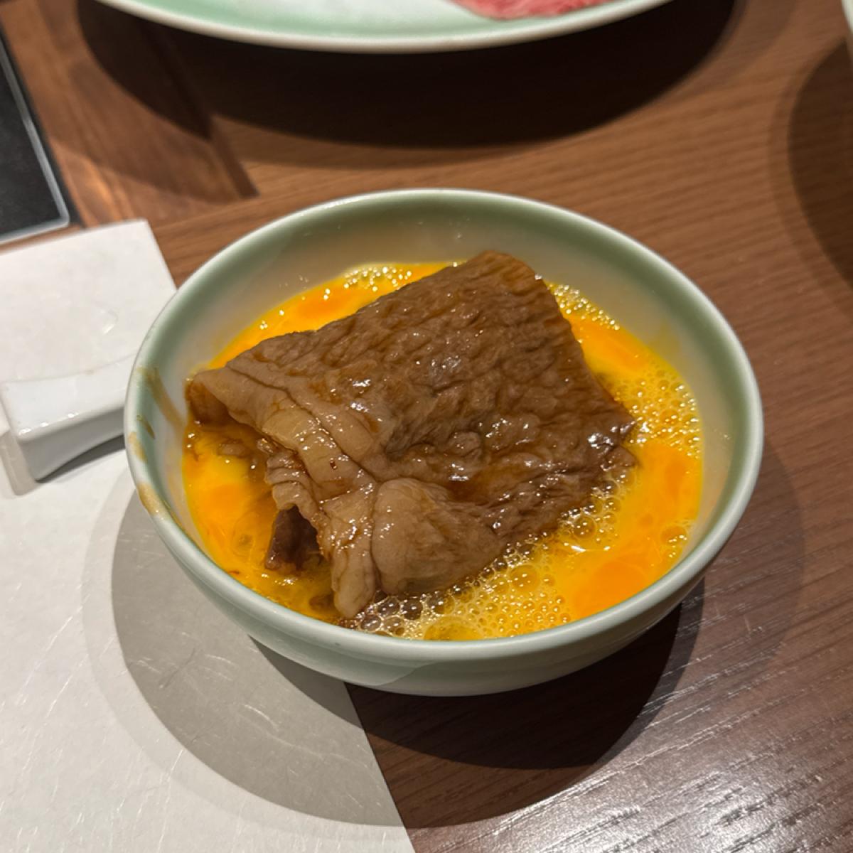 這次點的是壽喜燒的特選コース,專門的服務人員皆穿著和服。一開始以白糖煎和牛後,就會加入壽喜燒醬汁,並由服務人員放入蛋液之中,就可以享用第一片了!