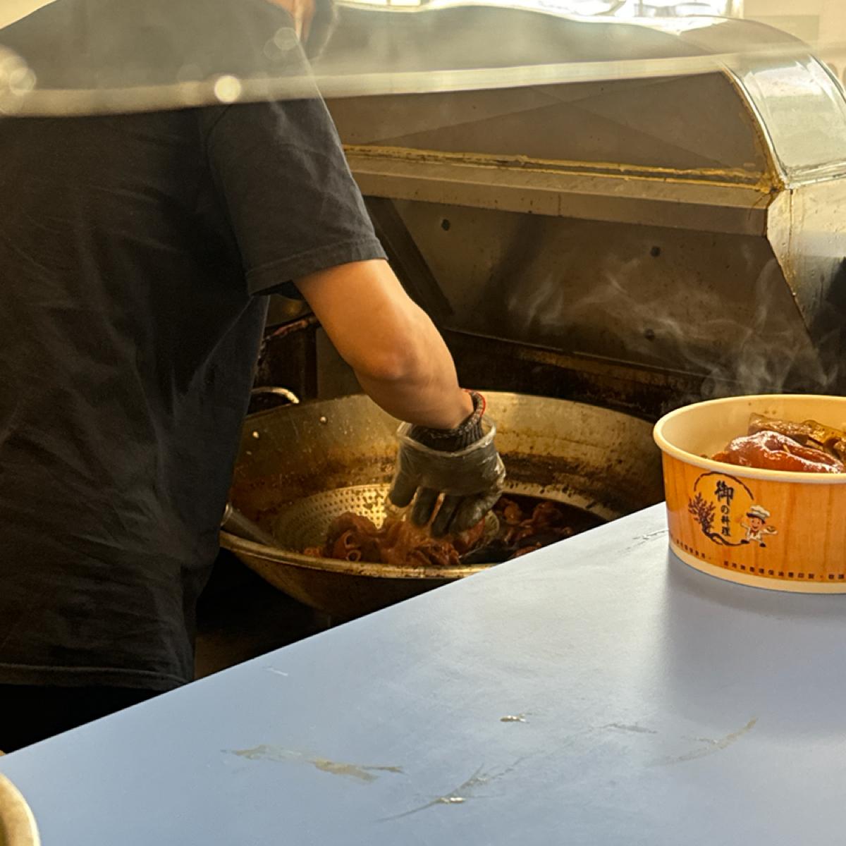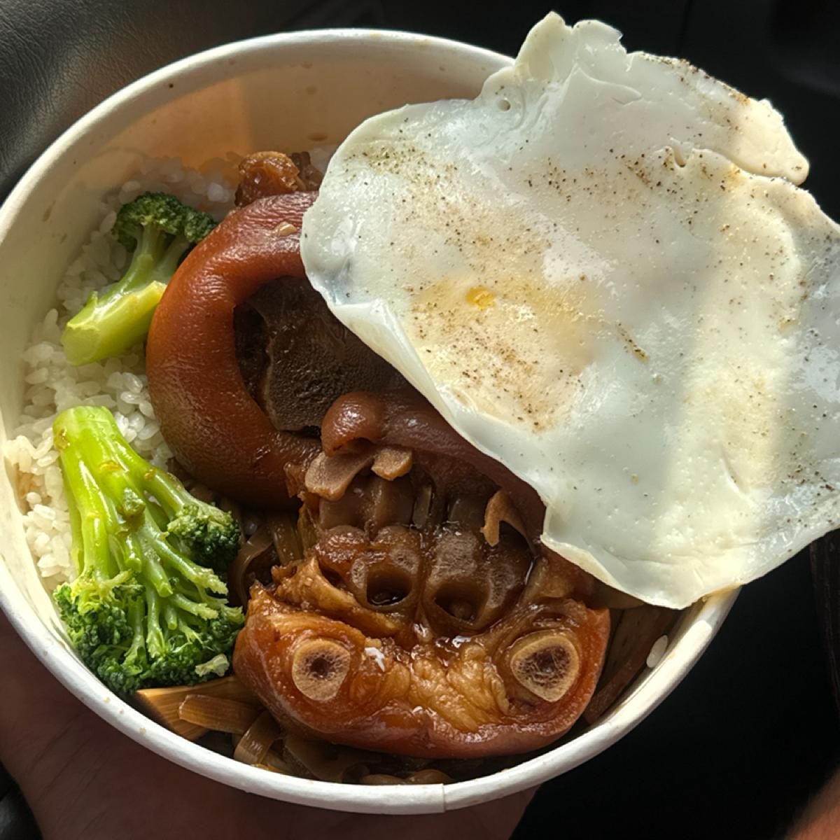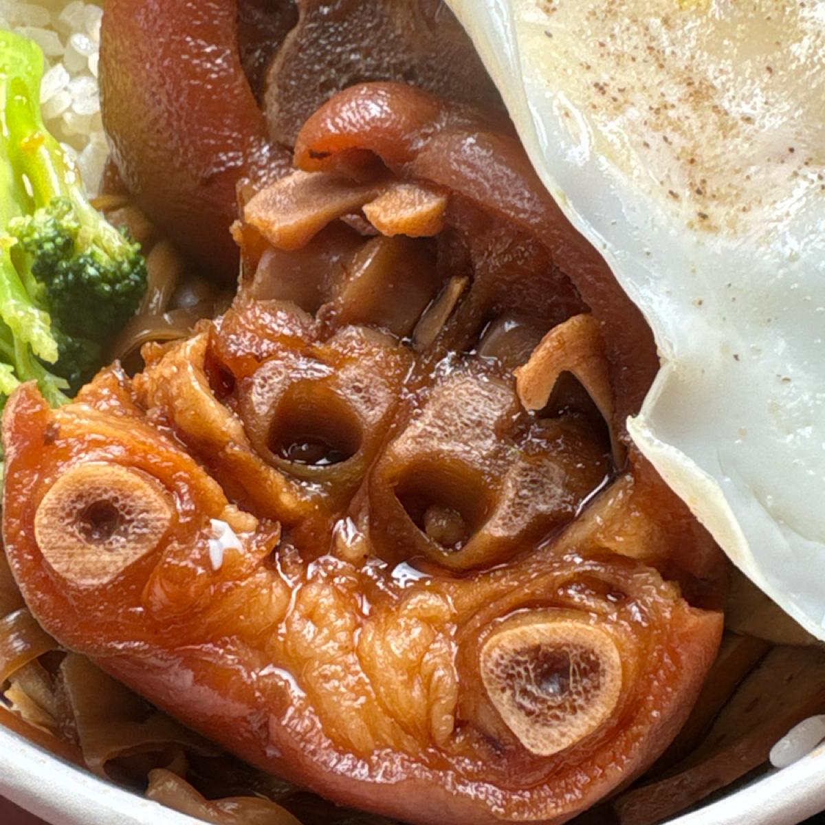 豬腳飯 💰100,滷得透徹,帶點黏口的膠質,有筋的部位更有咬勁,吃起來非常過癮。白飯淋滿他是滷味醬汁,甜甜鹹鹹非常下飯,可惜菜色沒有很豐富,只有兩朵花椰菜與筍乾豆乾,整個吃完會稍微有膩感。