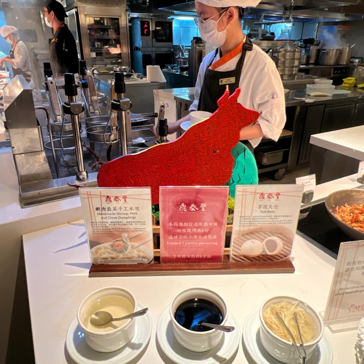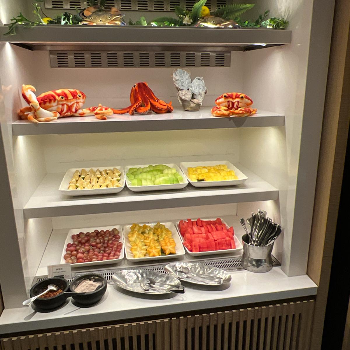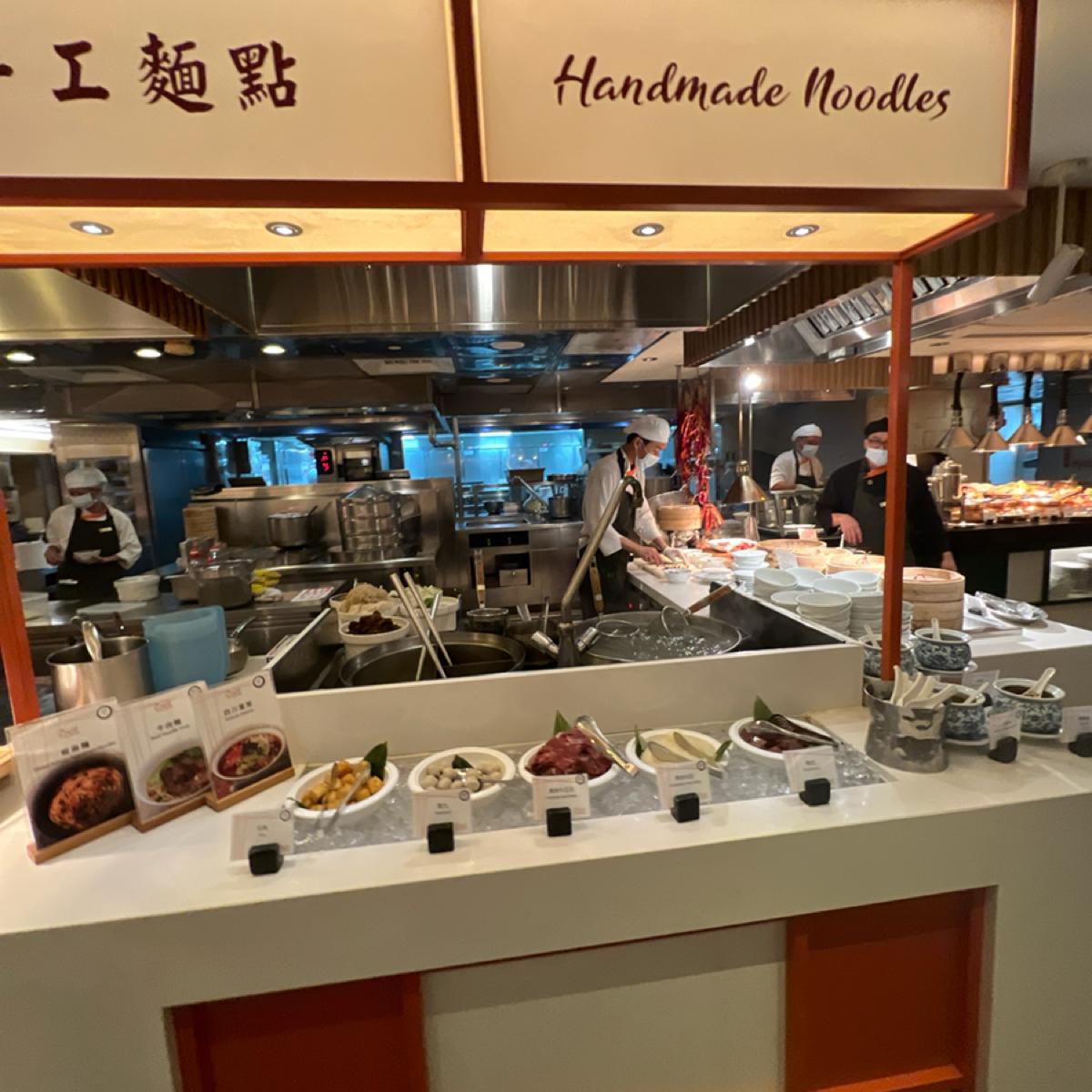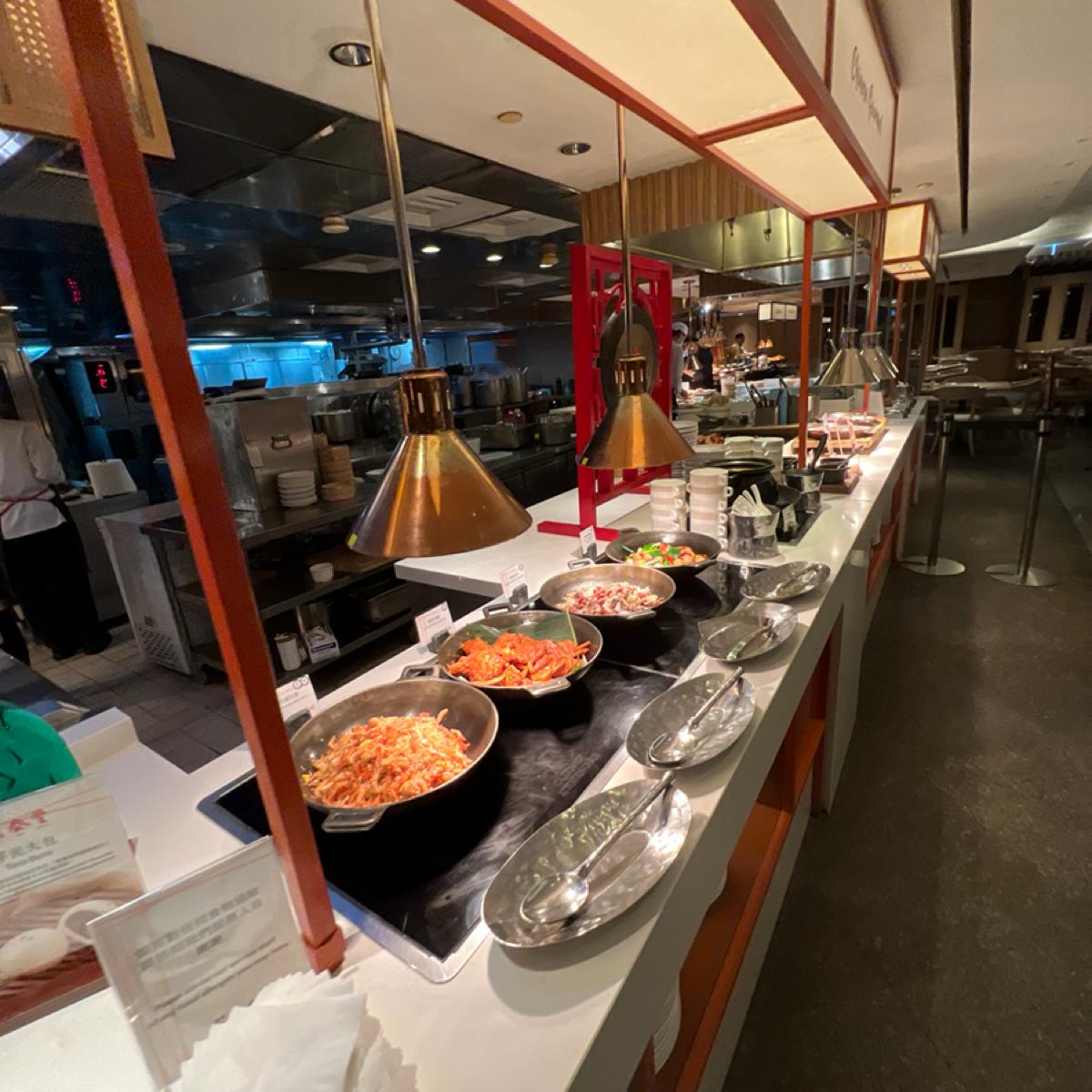 餐點部分整體普通,醃漬烤羊排及炭烤美國肋眼牛排但羊排偏硬難咬,牛排稍老。四川冒菜類似麻辣燙,牛肉麵第一碗的肉質偏硬,後來的牛腱好些,拿完第一輪想到的只有牛肉湯。鼎泰豐的蝦仁韭菜水餃水準一般,生魚片算新鮮,水果不甜,甜點看似好吃但表現失望,千層蛋糕甚至比塔吉特的還難吃。至少現炒義大利麵是熱的,椒麻麵調味不錯,另附花椒油及辣椒油可調整。