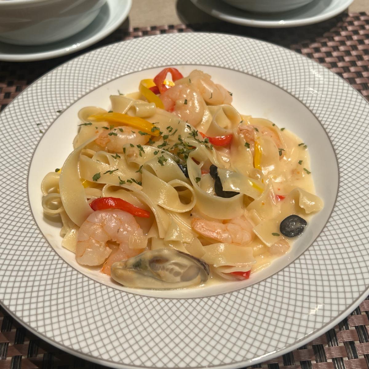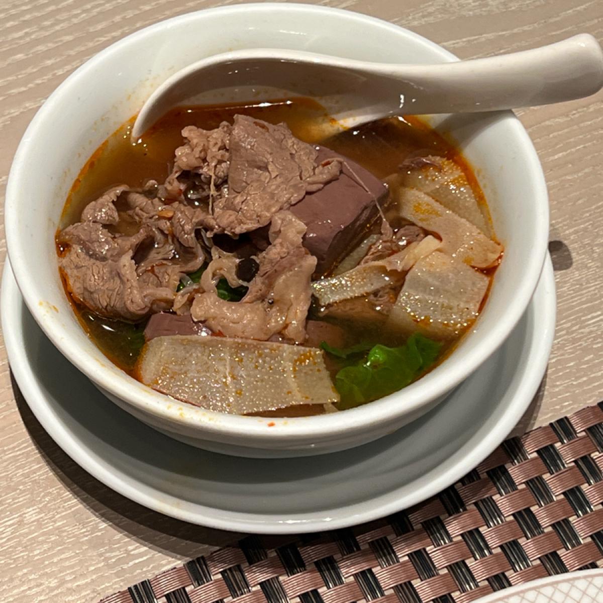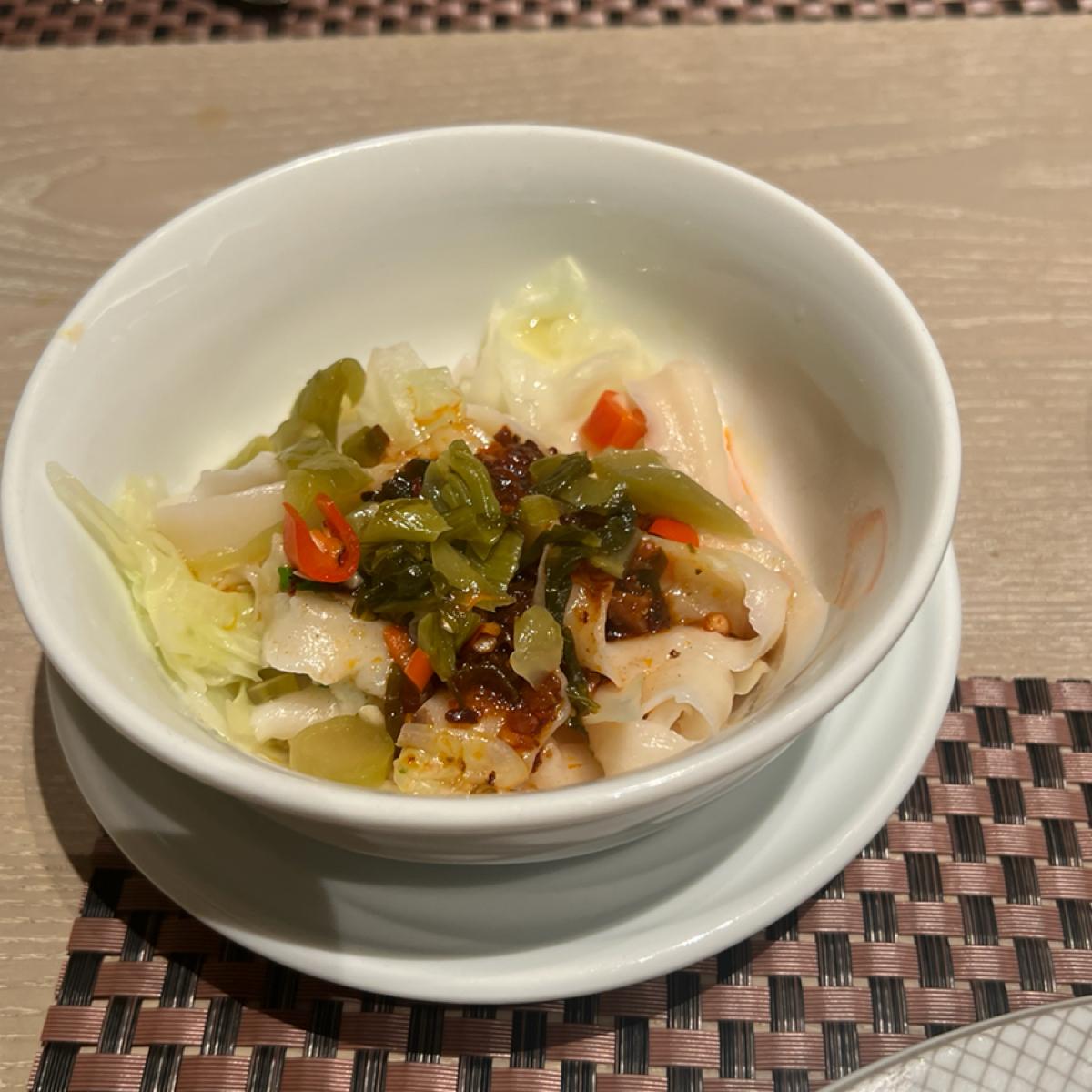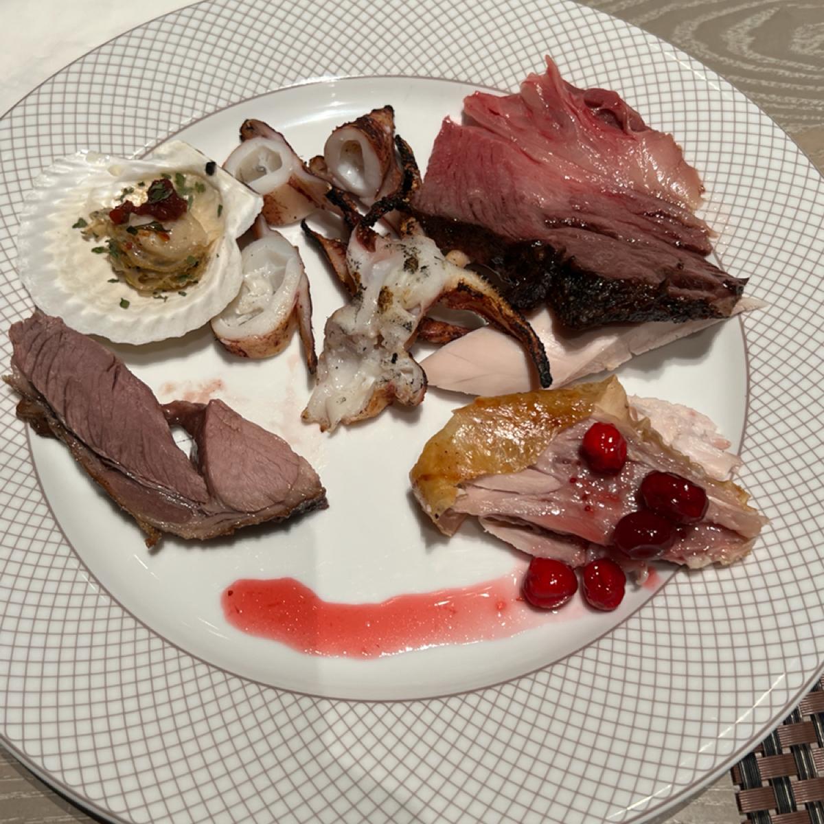 餐點部分整體普通,醃漬烤羊排及炭烤美國肋眼牛排但羊排偏硬難咬,牛排稍老。四川冒菜類似麻辣燙,牛肉麵第一碗的肉質偏硬,後來的牛腱好些,拿完第一輪想到的只有牛肉湯。鼎泰豐的蝦仁韭菜水餃水準一般,生魚片算新鮮,水果不甜,甜點看似好吃但表現失望,千層蛋糕甚至比塔吉特的還難吃。至少現炒義大利麵是熱的,椒麻麵調味不錯,另附花椒油及辣椒油可調整。