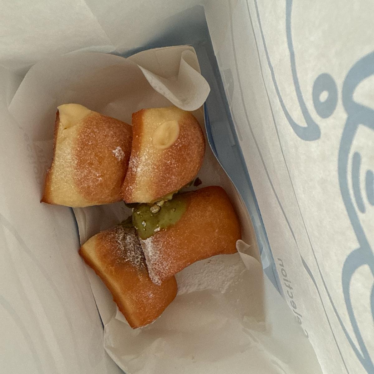 第一口咬下,覺得味道偏鹹,在香港吃了好幾間開心果gelato,都是偏鹹的味道,這個開心果法式甜甜圈也是一樣的鹹味。然後開心果口味的餡非常少,有點失望。