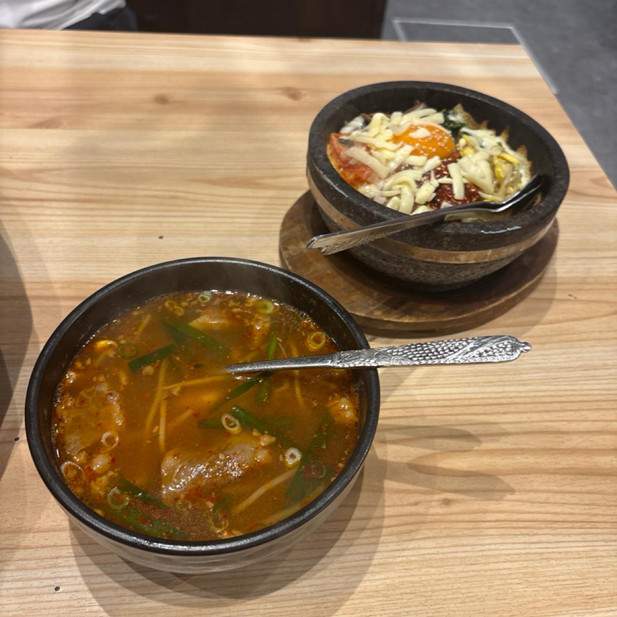 湯頭為微辣,放有米飯、涼拌菜和肉