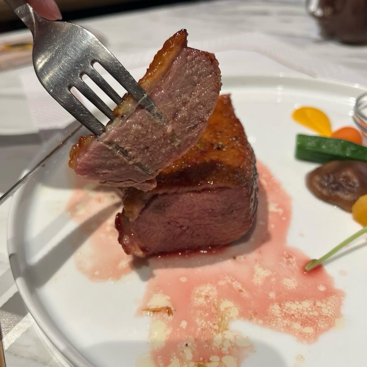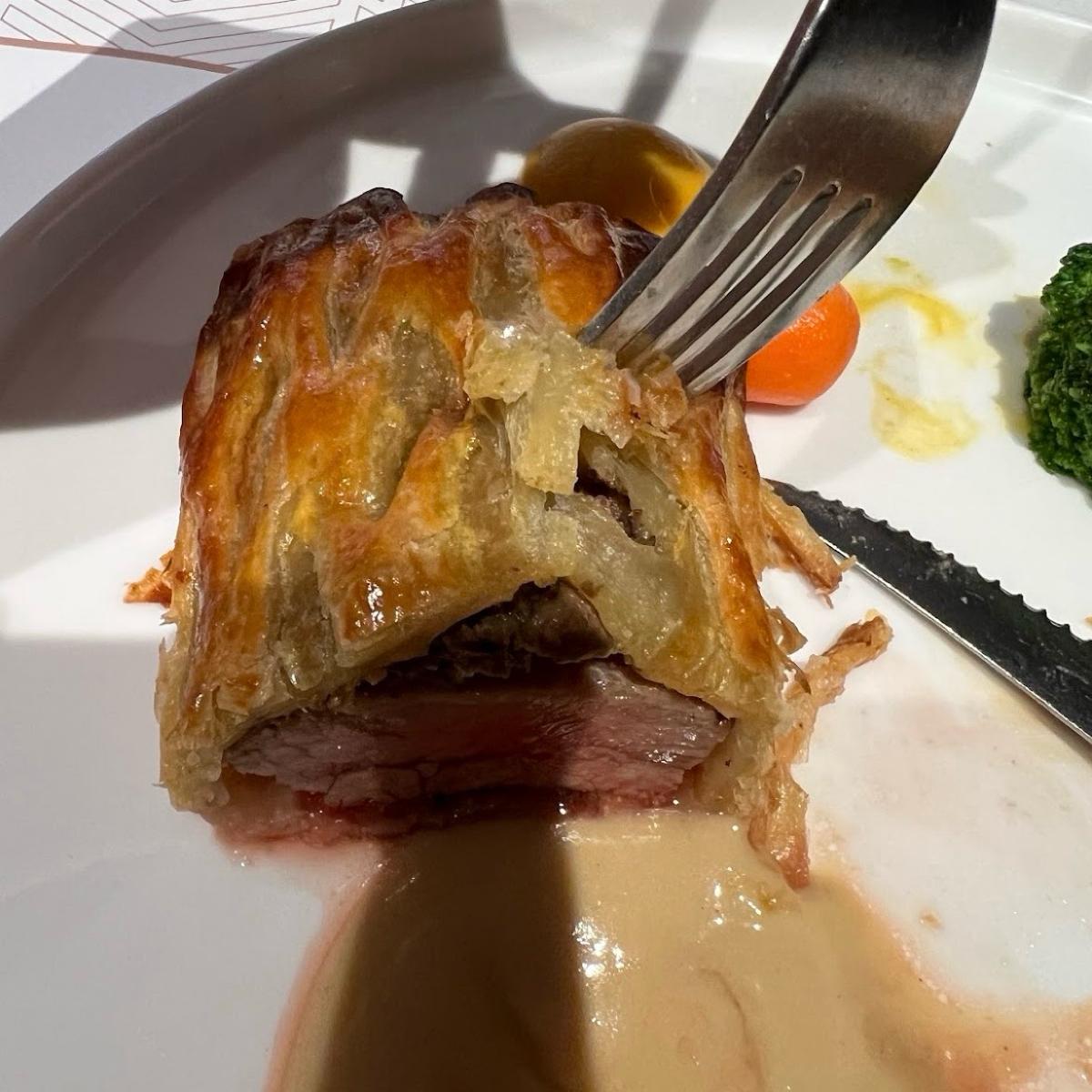 鴨胸的部分確實表現得不錯,外皮煎得酥脆,肉質軟嫩多汁,香氣十足,可以算是這次用餐的一大亮點。至於威靈頓牛排,雖然肉質中規中矩,但酥皮部分實在是扣分太多,本來應該要酥脆的外皮,卻是濕軟的,對威靈頓牛排來說這很扣分!濕軟的口感讓原本應該提升口感層次的部分反而變得無趣,和預期有一定落差。
