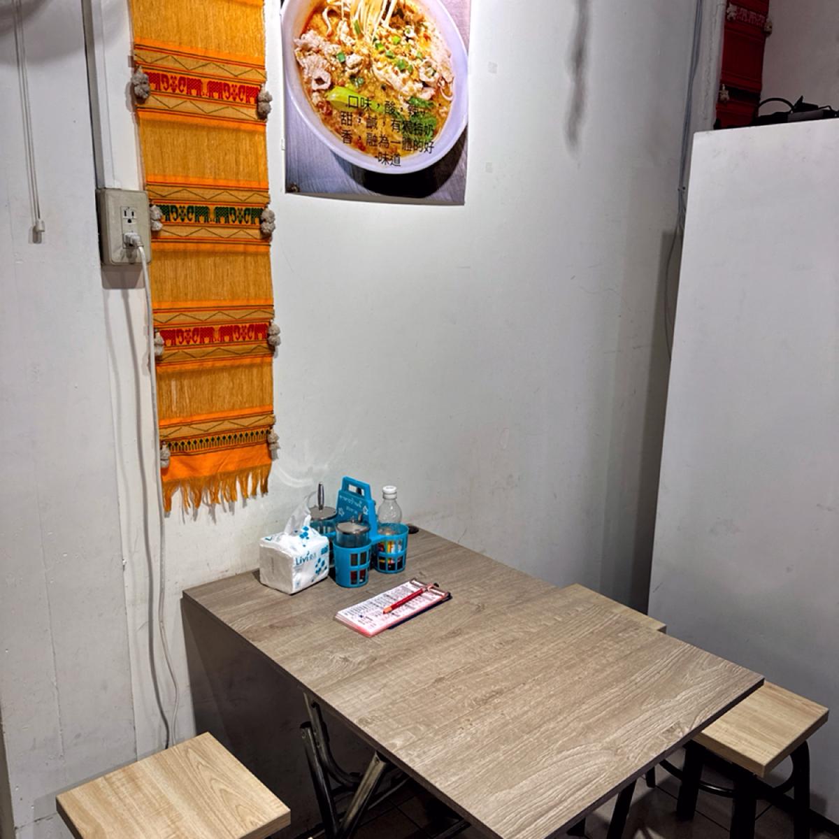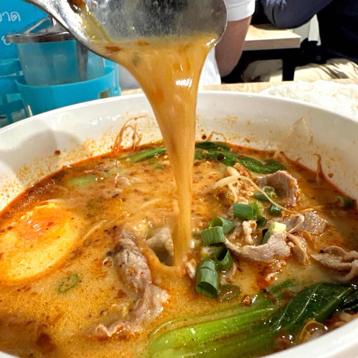 原本想說,店名寫著泰式船麵麵,那就點麵吧,但仔細一看... 菜單竟在酸辣湯+飯的旁邊『泰式泰奶酸辣湯+飯』旁邊加註了『泰國人人吃法』。
