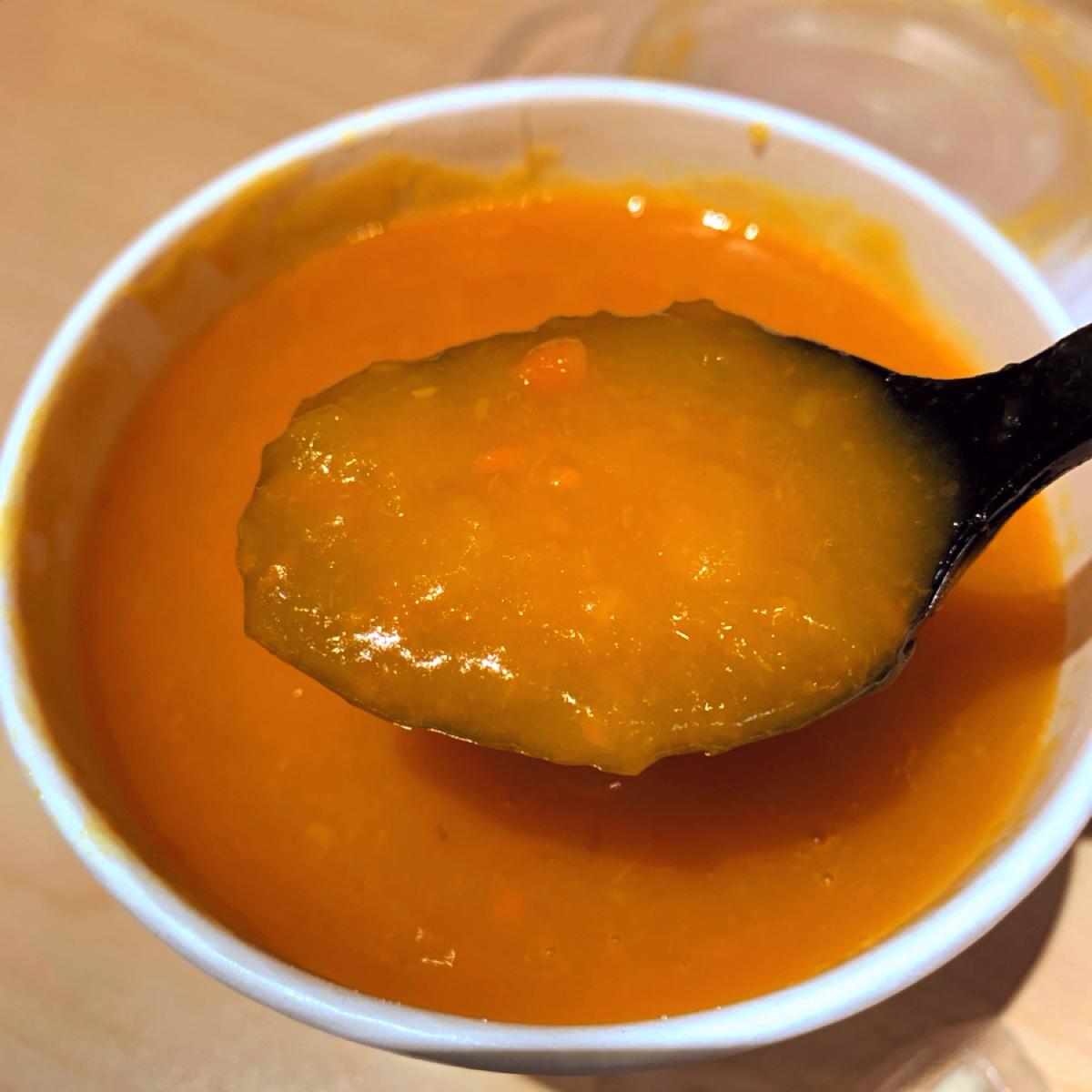 南瓜湯:已用 App 內建色溫調爆,還是不如現場看到的橘紅色。這是純健康的南瓜蔬菜湯,洋蔥、胡蘿蔔的蔬菜味都重,應該無奶油或鮮奶油,所以並不是南瓜「濃」湯唷。